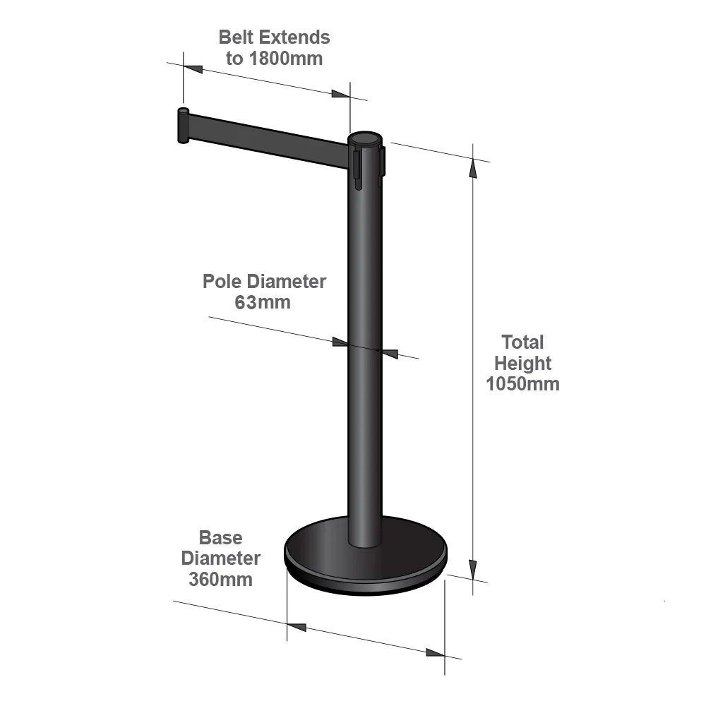 Stanchions, like retractable belt barricades and crowd control posts, feature a 4-way adapter that makes creating a queue or cordoning off areas simple. The belt itself is 1.8m long to easily attach to other posts or wall clips, and is black in colour for a sleek look that matches the matte black finish of the post. This stanchion is made from stainless steel in order to ensure long-lasting use.