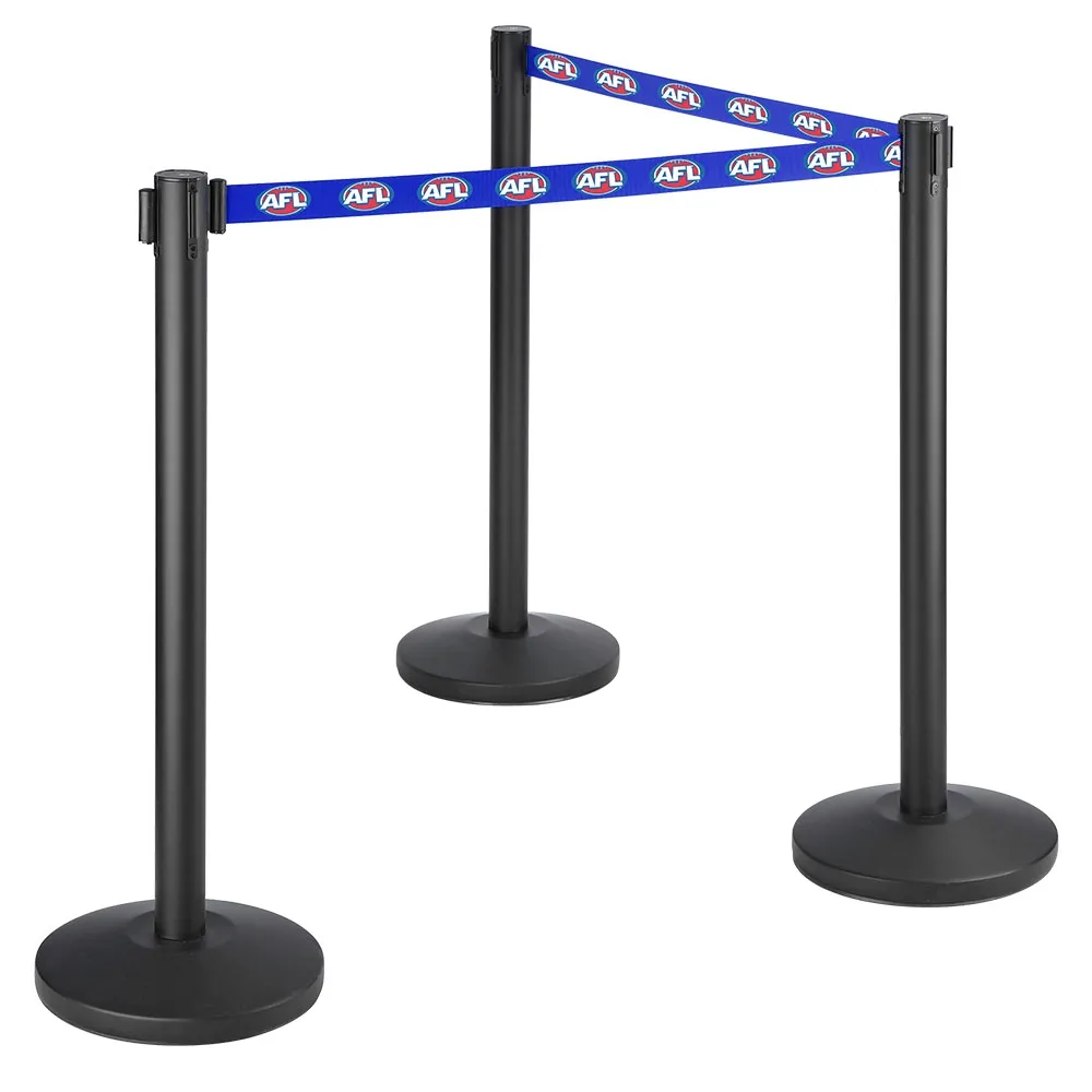 - Steel stanchions have dual-sided printing on belt with custom logos shown in 3 colours