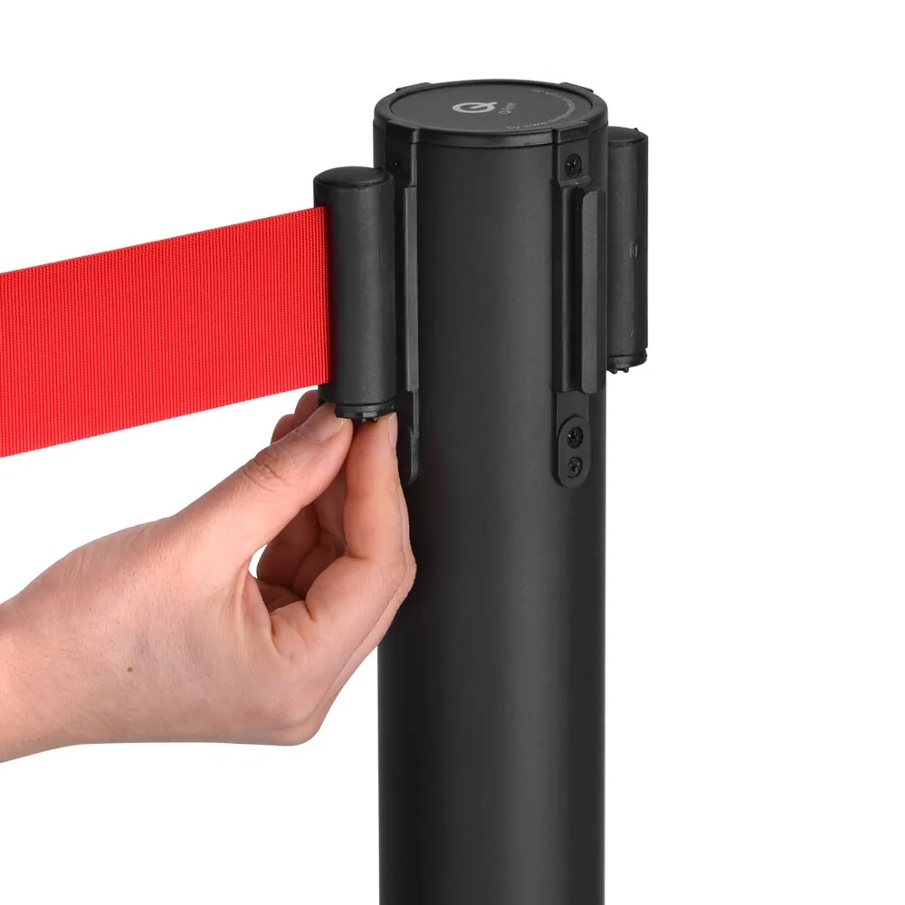 This crowd control post, stanchion is made from stainless steel with a matte black finish for a stylish look. The post top features a 4-way adapter, with the end of the belt having a tamper-proof clip that helps secure the barrier once in place. The easy to assemble display requires no tools, and has a weighted base to provide stability. The bottom of the base has been rubberised in order to prevent scratches as well.