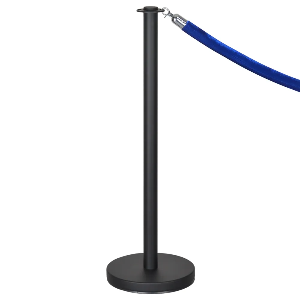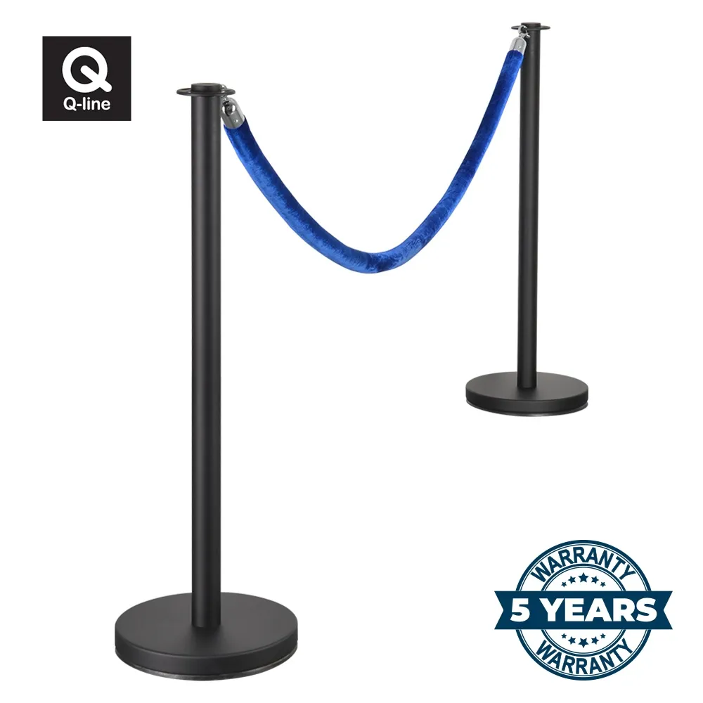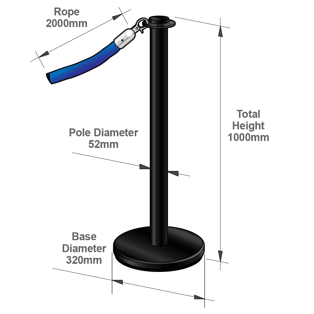 - These rope barrier posts are manufactured in stainless steel a matte black powder coat finish. Each queue post is 1 metre tall and the set of 2 includes one 2 metre long blue velvet rope at 5cm in Ø. They also come with a 5 year warranty.