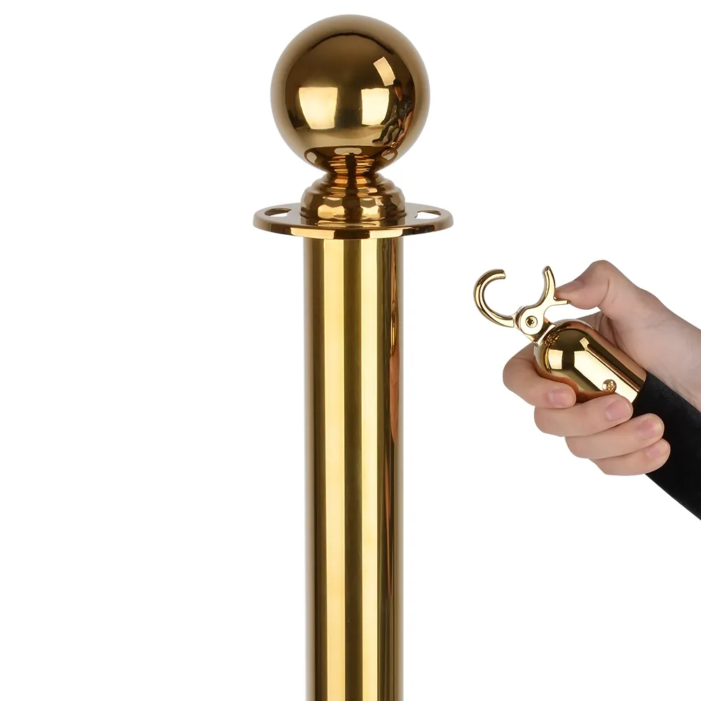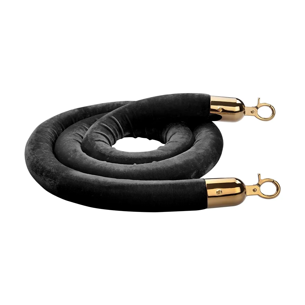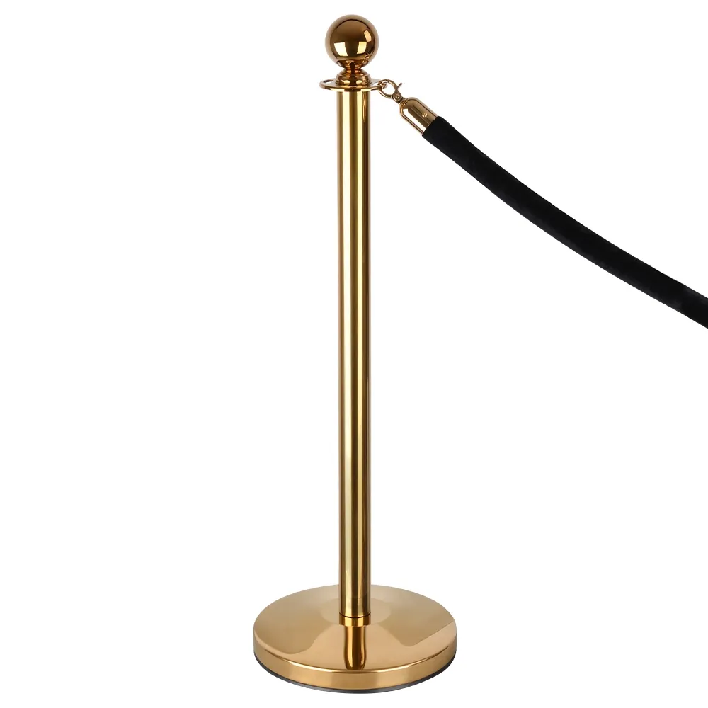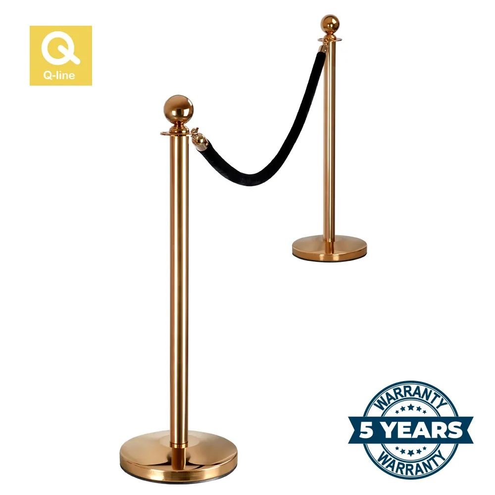 • Our Q-Line gold rope barrier posts are titanium coated with a polished brass finish and feature the classic round head. Posts are accompanied by the deluxe black velvet rope with matching gold hooks.