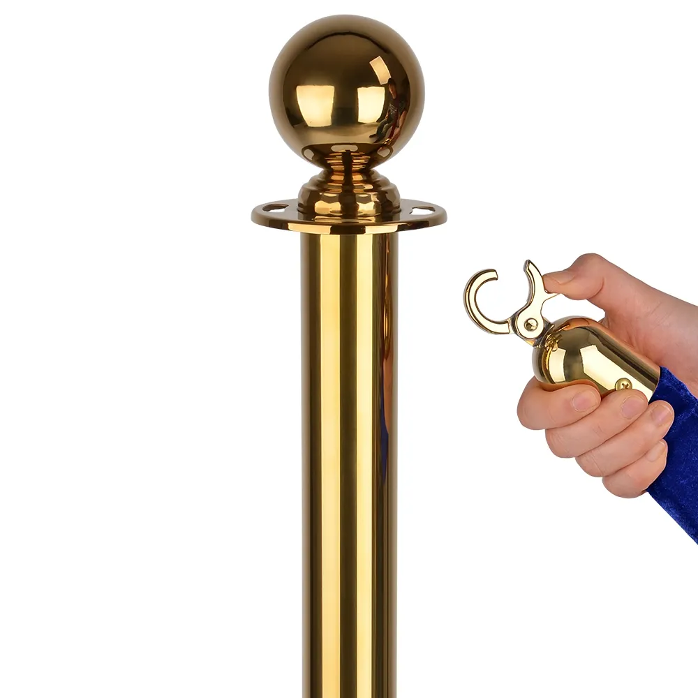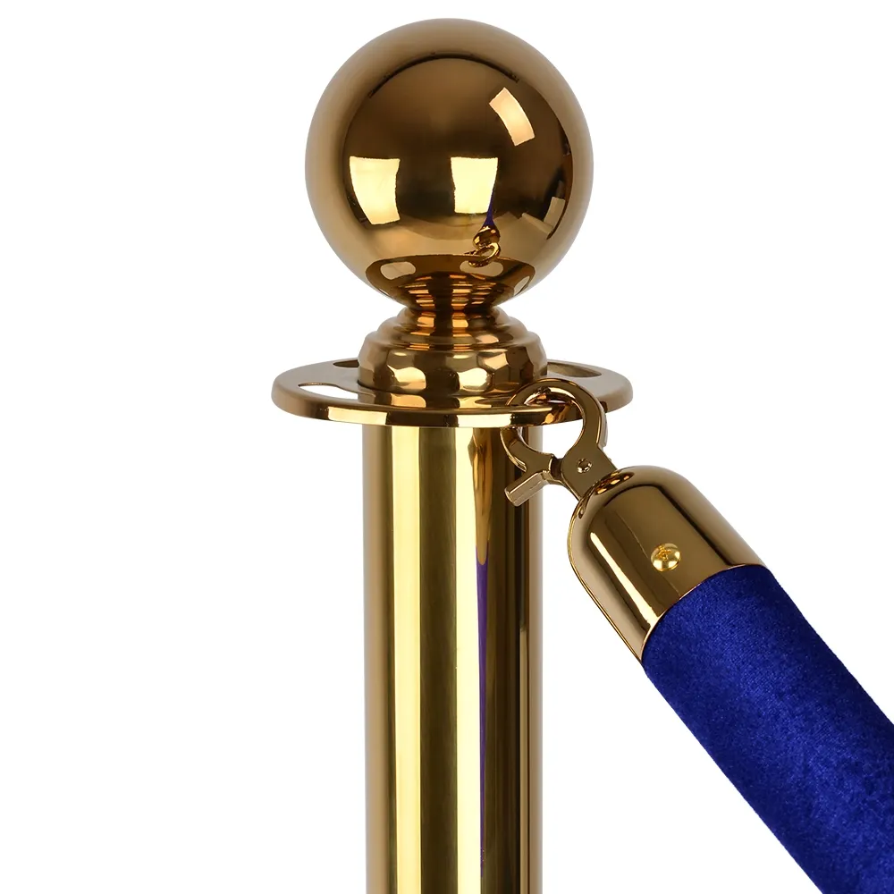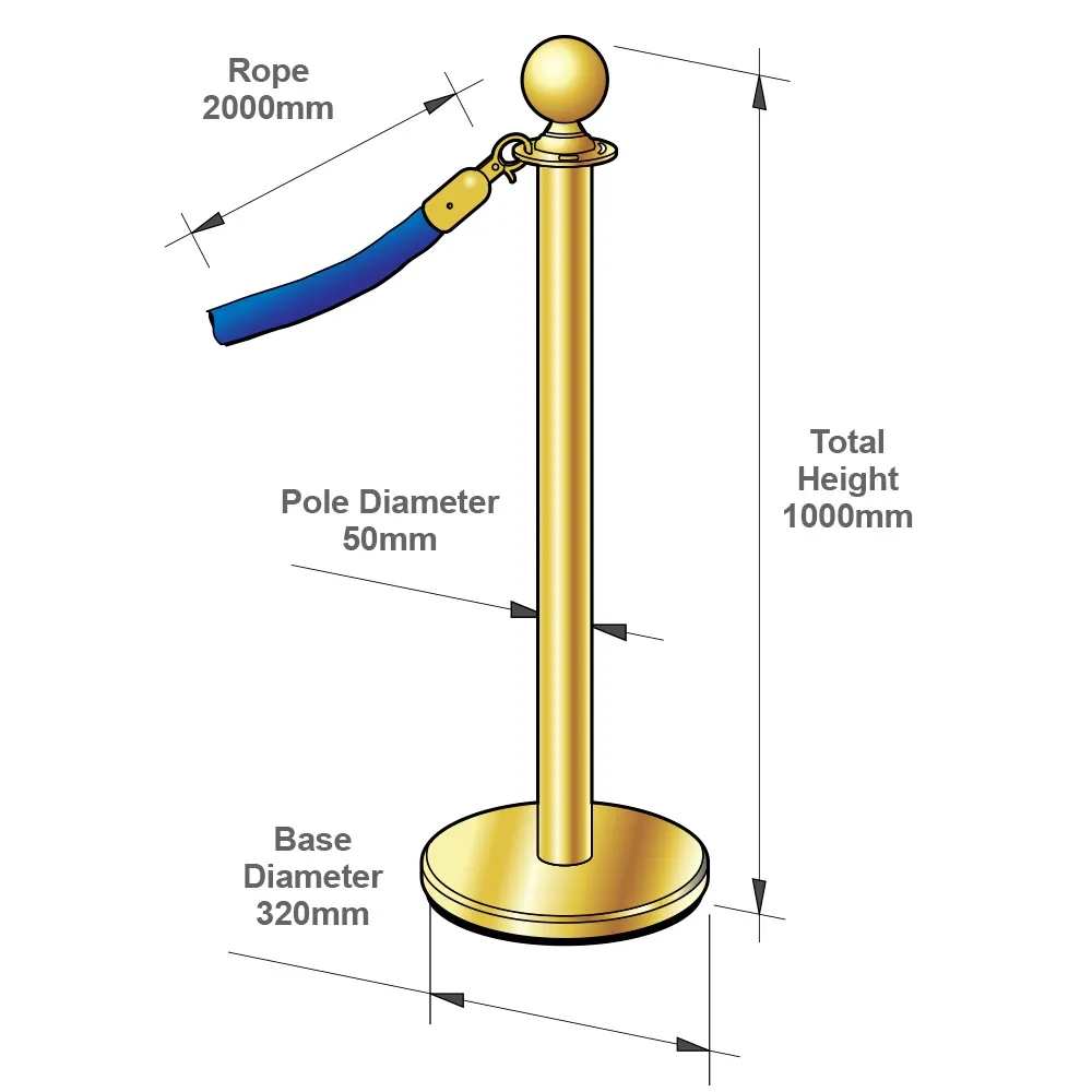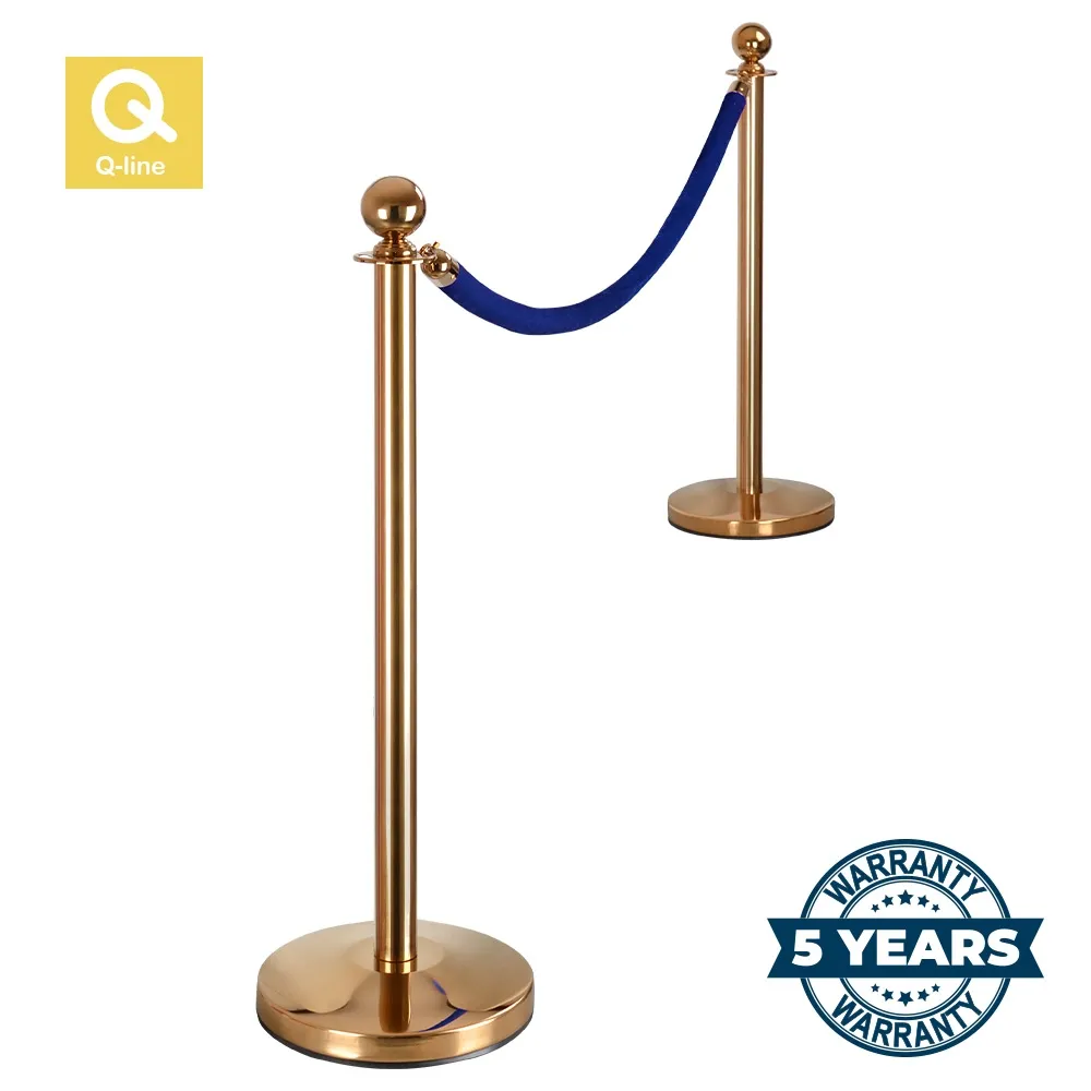 - Q-Line classic round head gold rope barriers are constructed in stainless steel which is coated in titanium for a hardwearing finish that looks just like polished brass. This set includes a deluxe blue velvet rope.