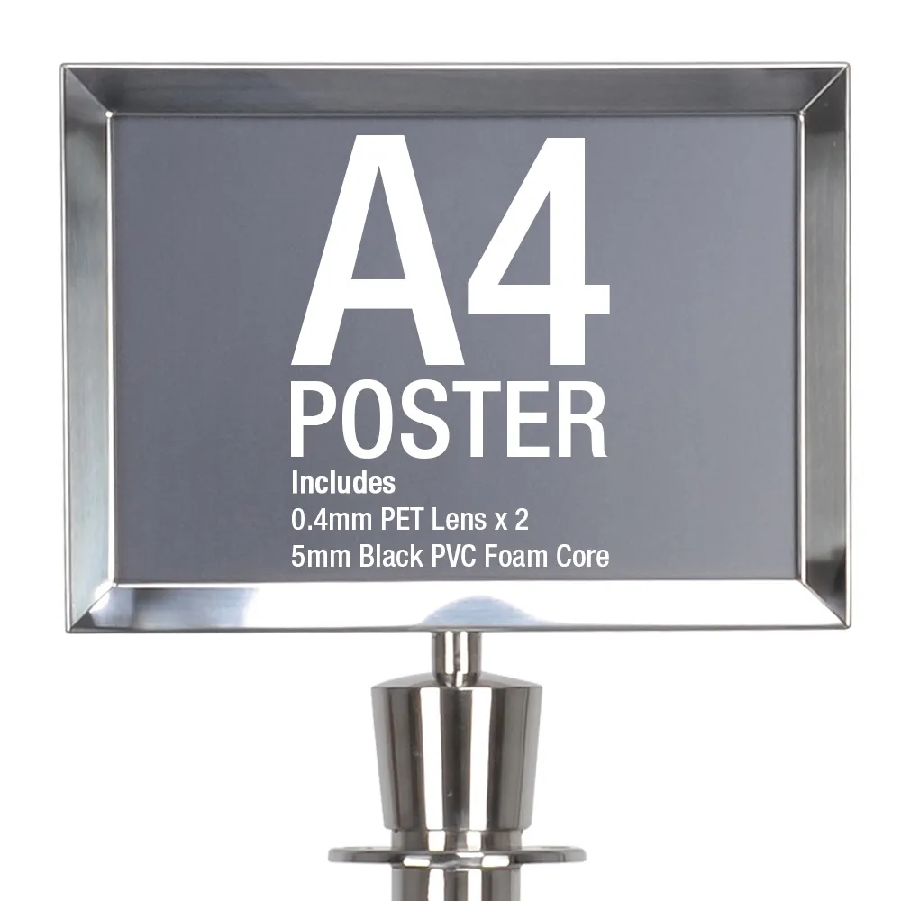 This is a landscape format sign holder comes with a backing board and protective lenses to present your sign within any professional environment. The changeable sign holder is manufactured from stainless steel and has a mirror finish. It has been design to suit any interior space and can be used together with other rope barrier posts from the Q-line range.