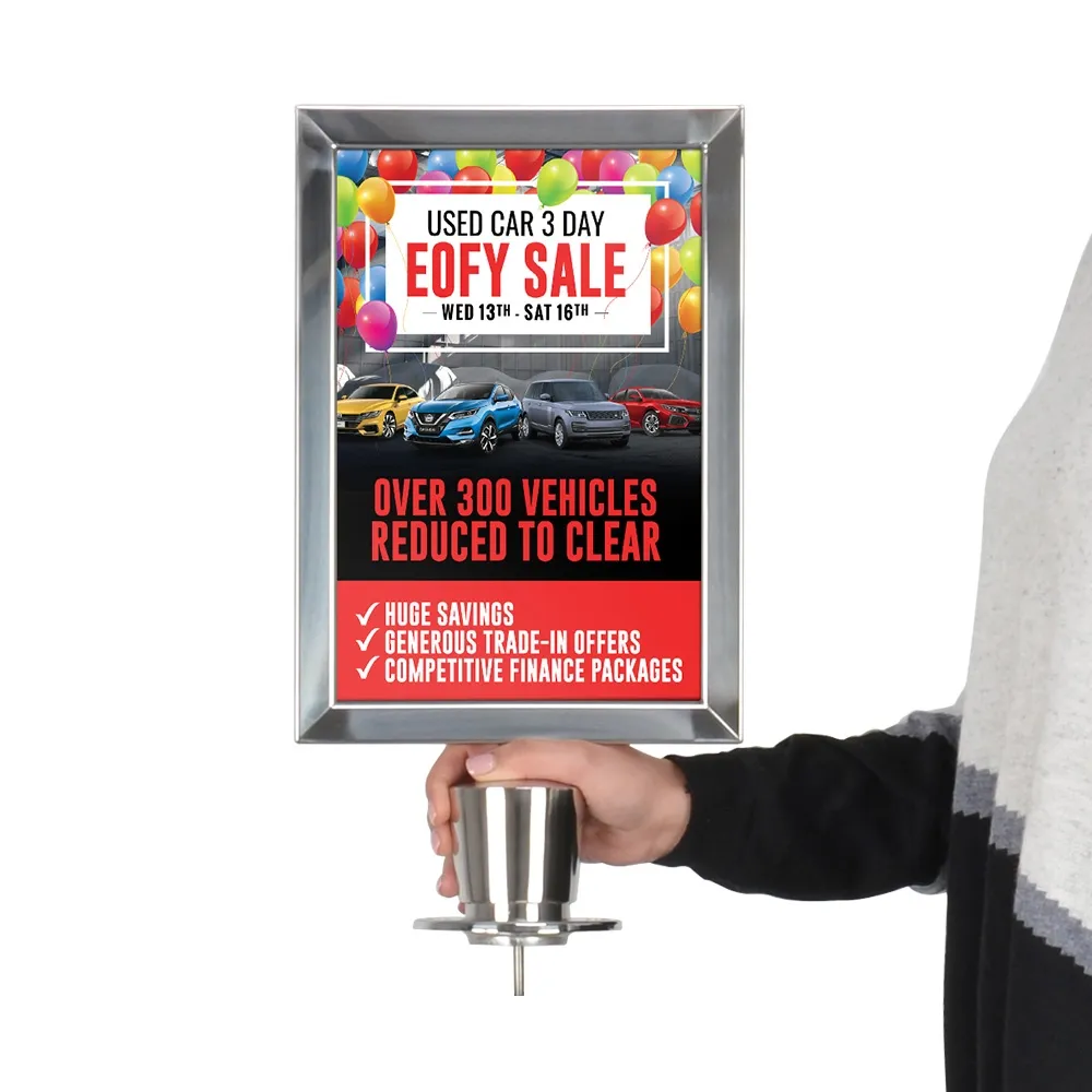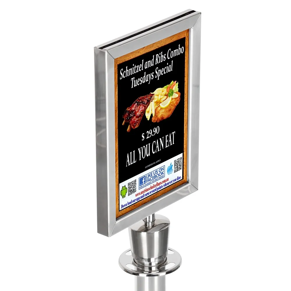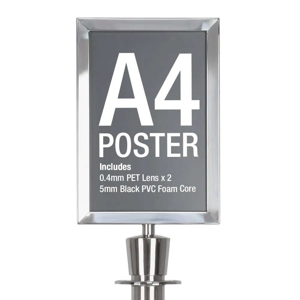 Designed exclusively for use with the Q-Line range these sign holders are screwed onto the top of your stanchion post. They are finished in polished silver and include a backing board and protective lenses for your A4 size artwork. Your can display two A4 posters back to back.