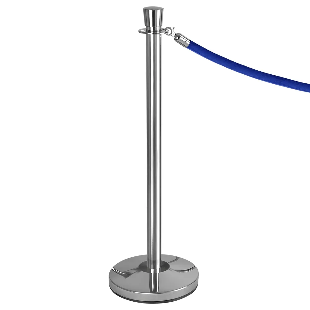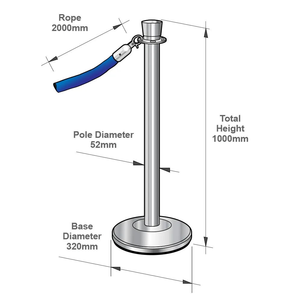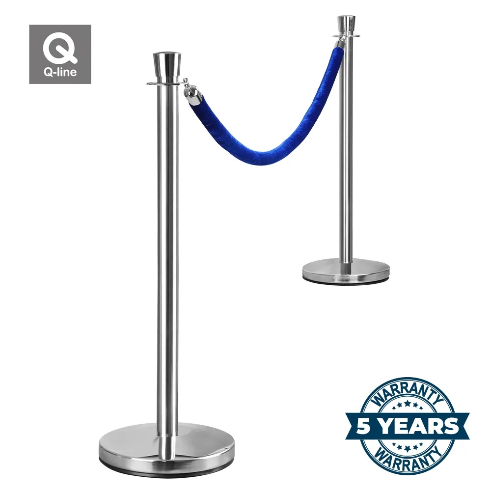 - This rope barrier set is manufactured from stainless steel which has been polished to a chrome mirror finish. Posts stand tall at 1 metre tall & the blue velvet rope is 2 metres long, & 5cm in Ø. Included is a 5 year warranty.