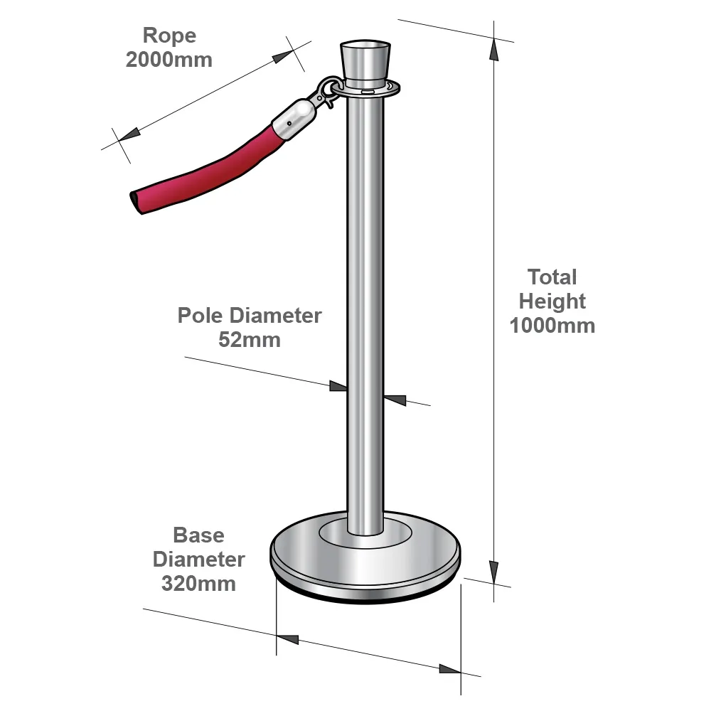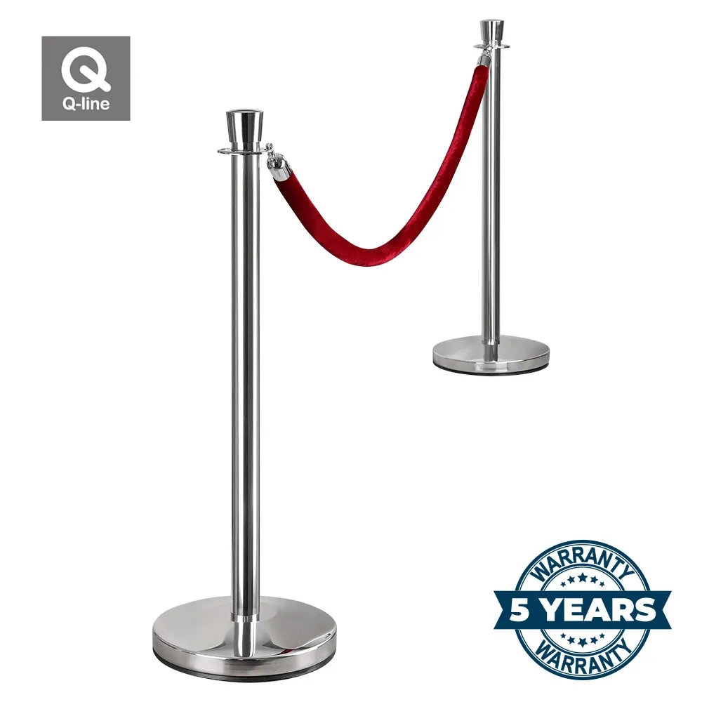 - Quality stanchions with a 5 year warranty. Stainless steel construction with a high polish finish that looks just like chrome, but will not rust. Posts are 1 metre tall the rope is 2 metres in length and 5cm Ø.