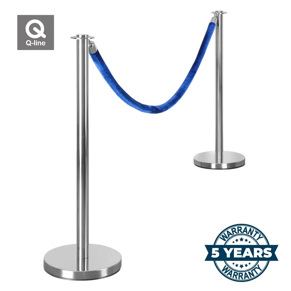 - These rope barriers are manufactured from stainless steel which has been polished for a chrome like finish. Posts stand tall at 1.05 metres & the black velvet rope is 2 metres in length & 5cm in Ø. Included is a 5 year warranty.