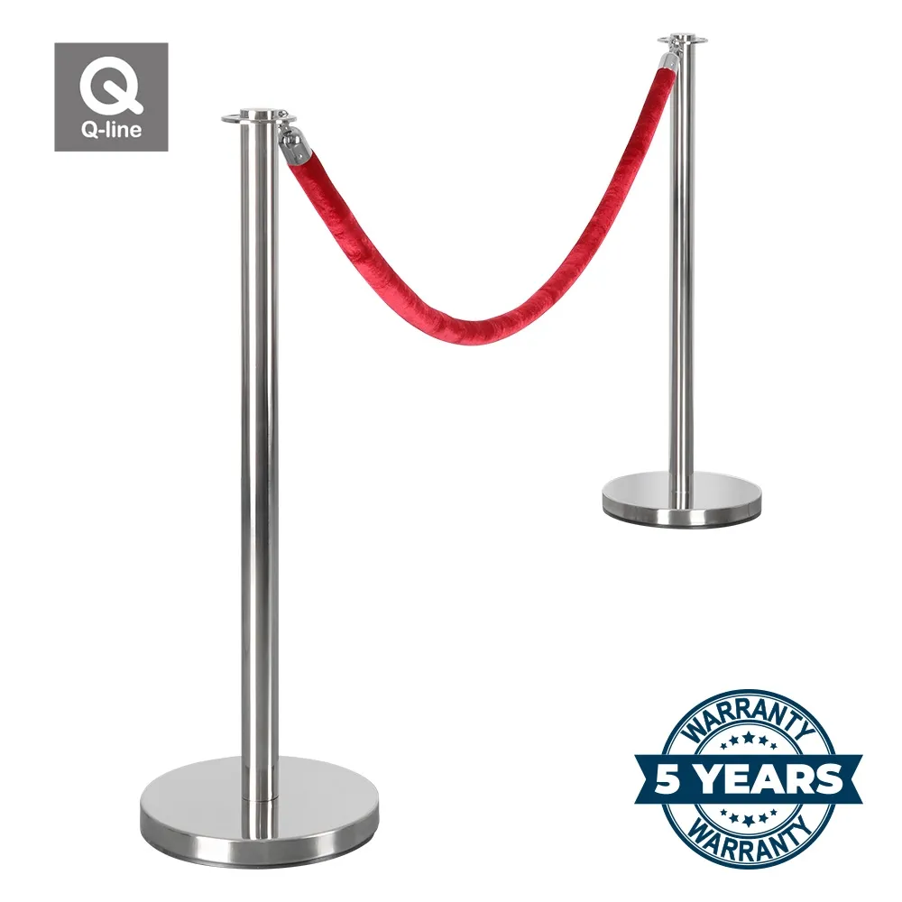 These rope barriers or stanchions with red rope are ideal for a variety of situations such as art galleries, exhibitions and corporate offices. The rope barriers can be used to create a queue system or simply control a space around objects on public display. The posts themselves are high quality stainless steel, polished to give them a chrome look. Created with stability in mind Q-line rope posts feature a weighted base and rubber rim to prevent slipping or scratching of floor surfaces.