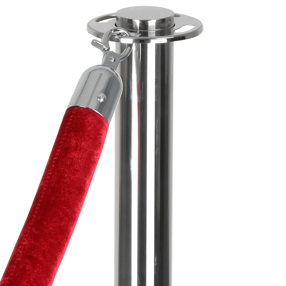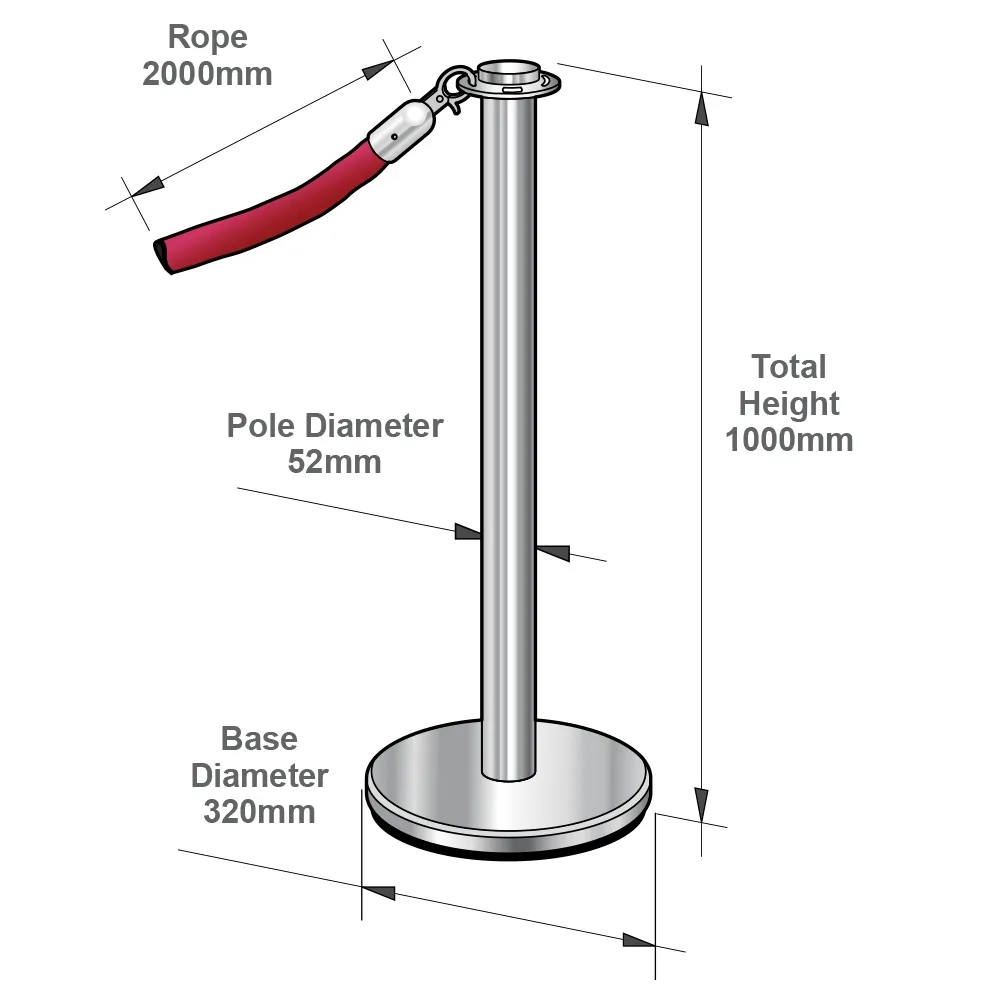 • These rope barriers are manufactured using stainless steel and have been polished for a chrome appearance. Included in the unit are 2 stanchions which are 1 metre tall. A deluxe 2 metre long red velvet rope at 5cm in Ø is also included.