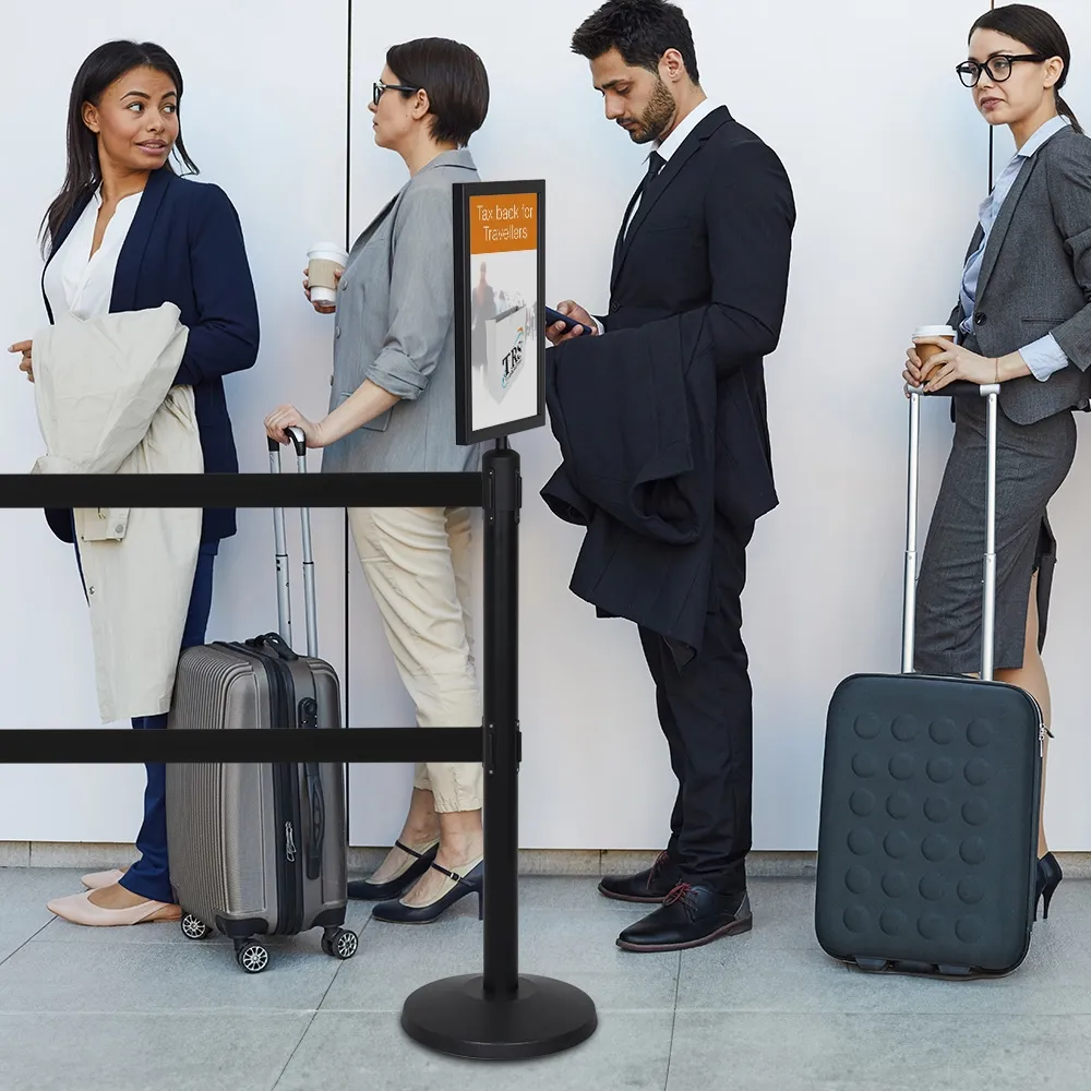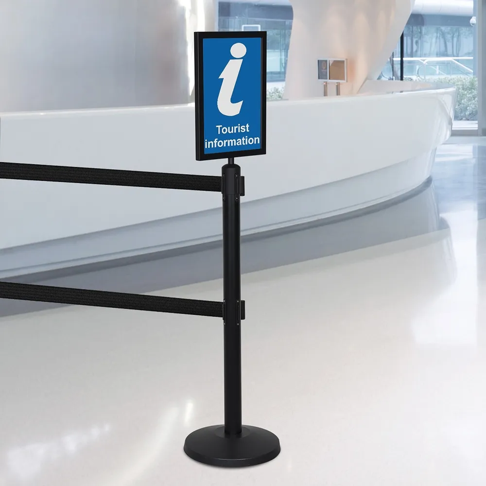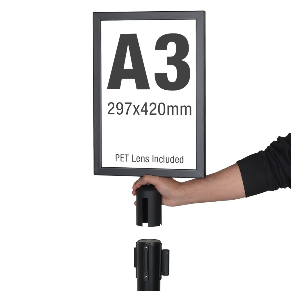 A dual belt stanchion, like queue barrier posts, features a sign frame to display adverts or signage to help direct passersby. The frame is designed to hold A3 (420 x 297mm) standard sized graphics in portrait orientation. The dual-sided frame maximises view to people in all directions, and has an anti-glare lens for each side to help protect against grime build up as well as improve readability. The 1.025m tall barrier post is standard sized, with a 4-way adapters with each belt to make creating your desired configuration easy.