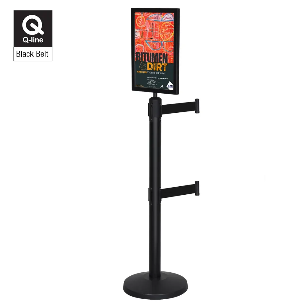 This dual belt stanchion has multiple belts that prevent people from easily ducking under to avoid staying in a queue or to get around a cordoned off area. Each belt is 3m long to easily connect to walls or other stanchions, with a lockable connector on the end that securely attaches so it doesn't slip off with ease. The belts are made from heavy duty woven nylon and black in colour to match the post. This post is found at cinemas, information centres, museums, retail stores, banks, and other locations where setting up queues or sectioning off areas helps maintain an orderly experience for visitors.
