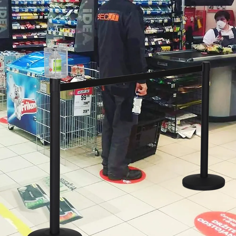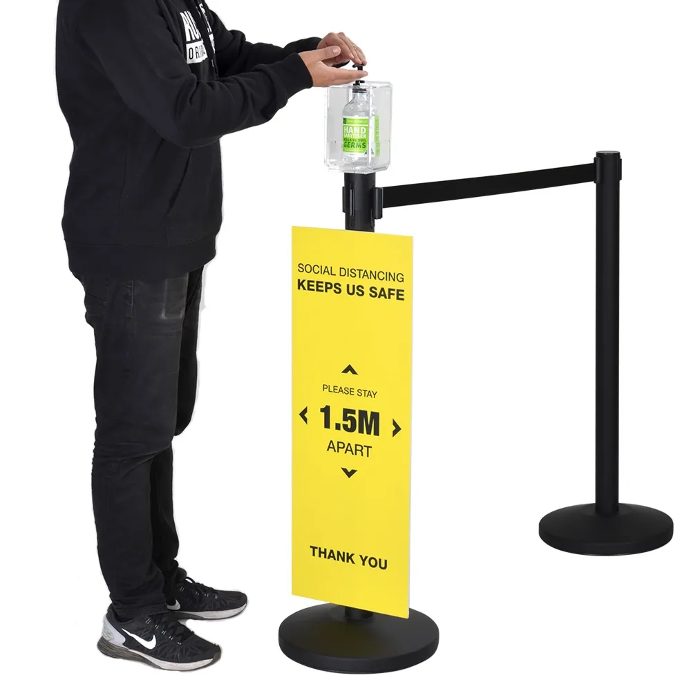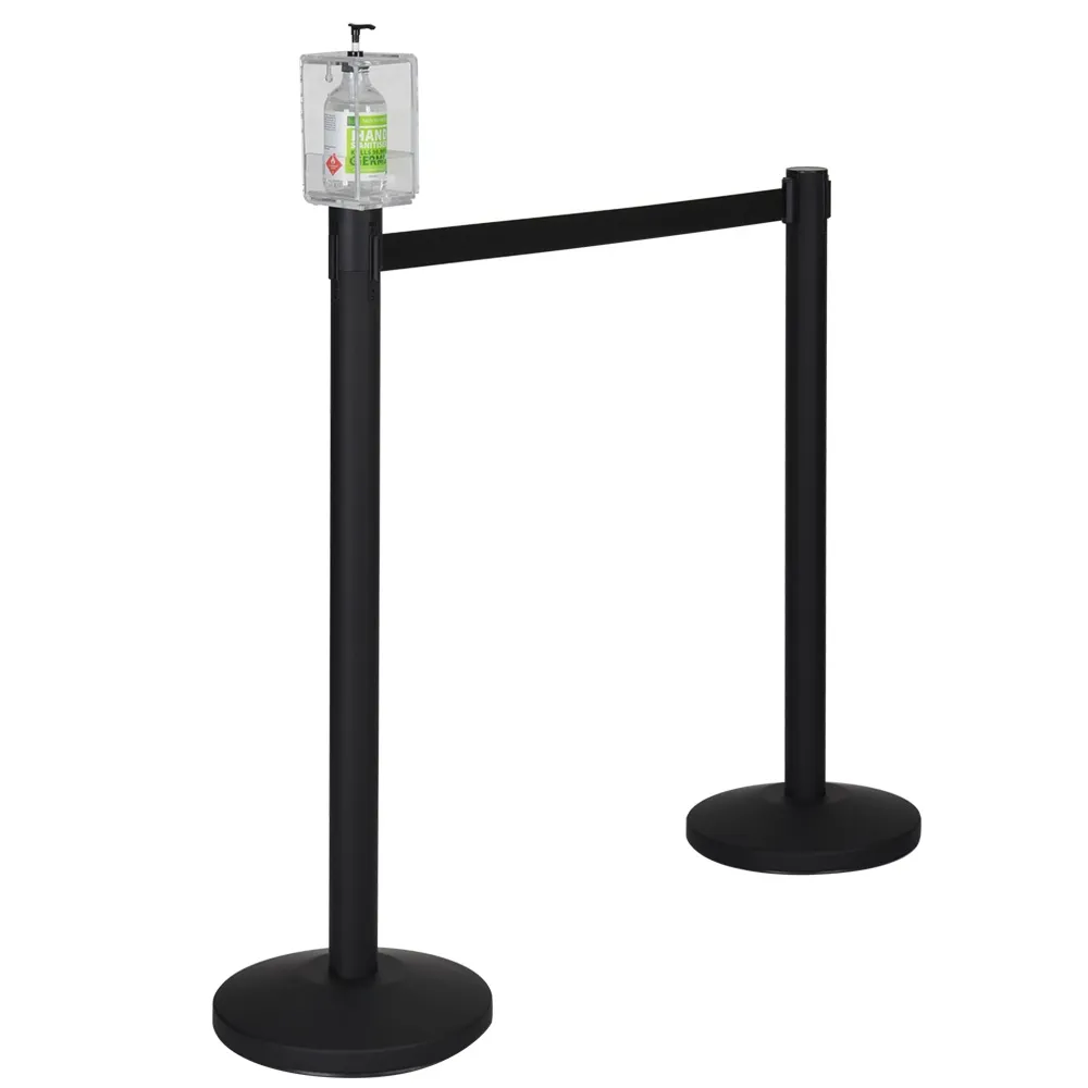 In need of belt barrier sanitiser stations to help visitors form a queue whilst maintaining proper hygiene practices? This hand sanitiser station includes all you need to establish an orderly queue that allows visitors to readily remove germs from their hands, helping to stop the spread of diseases such as the coronavirus. An acrylic container fits atop one of the two included posts to hold different sizes of hand sanitiser gel. The easily adjustable box fits 250ml & 500ml bottles and sizes between 110 and 160mm tall to work with many brands.