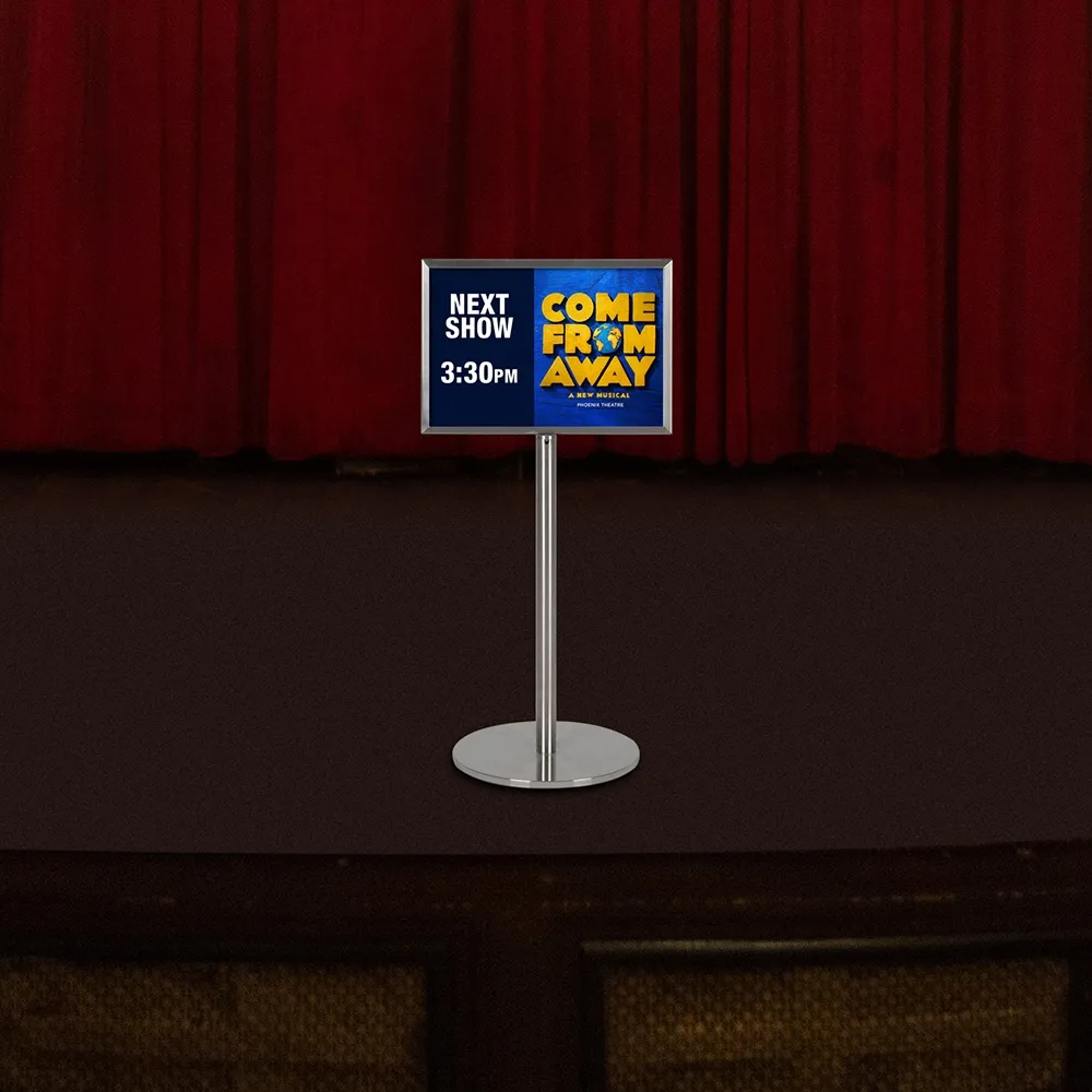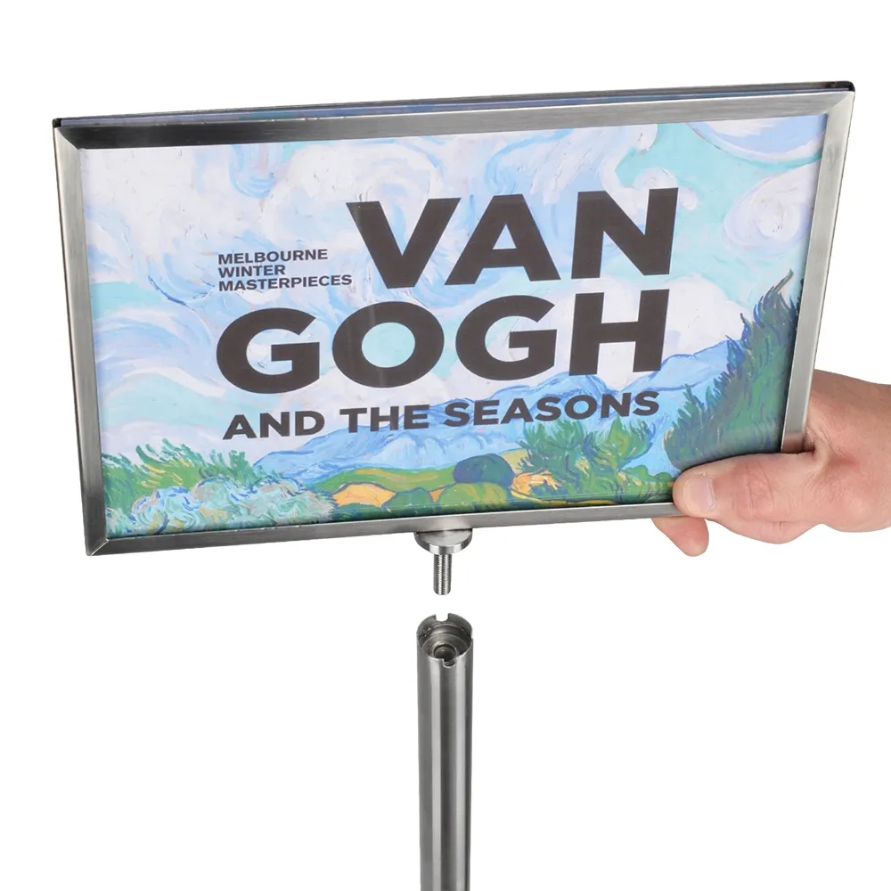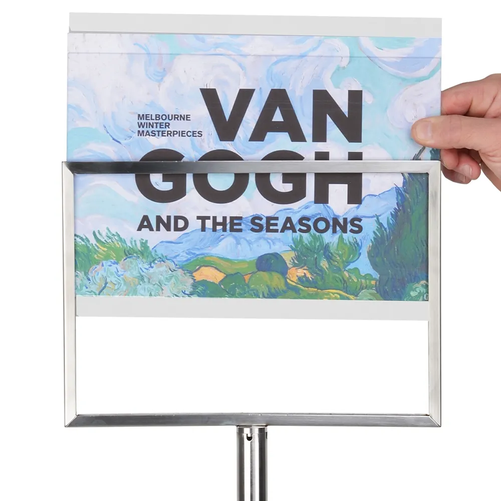 Floor stands for signs have a slide-in design that requires no tools for quick change-outs in seconds. The freestanding poster displays also have PET lenses provided that both prevent grime and dust build-up on posters and deter vandalism by preventing easy access directly to signage. This unit fits in perfectly with our range of gallery barriers designed to cordon off areas without being obtrusive thanks to the short stature and use of elasticised cord that is visible without blocking view.