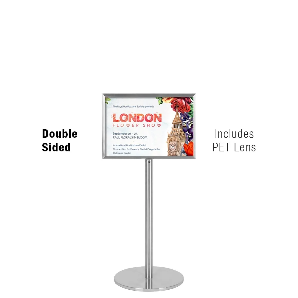 These poster holders, floor stands for signs are able to display A4 (297 x 210mm) posters in landscape orientation to help inform of sales, promotions, or direct visitors at your location! The frame is two-sided to be seen in multiple directions at once from the small 230mm diametre footprint. The steel base of this unit holds most of the _kg weight to ensure stability and make positioning the unit simple for any employee. Rubber feet on the bottom help to prevent damage to floors and help keep the unit from skidding out of place as well.