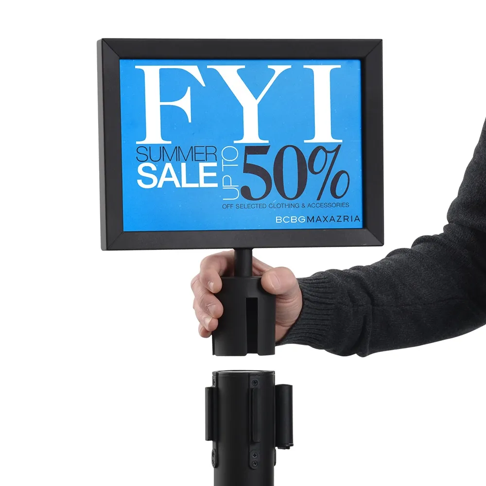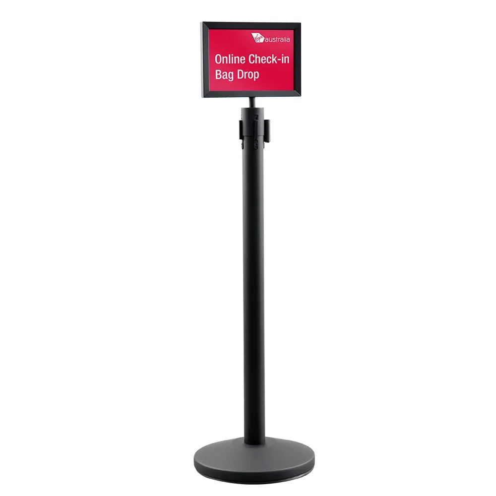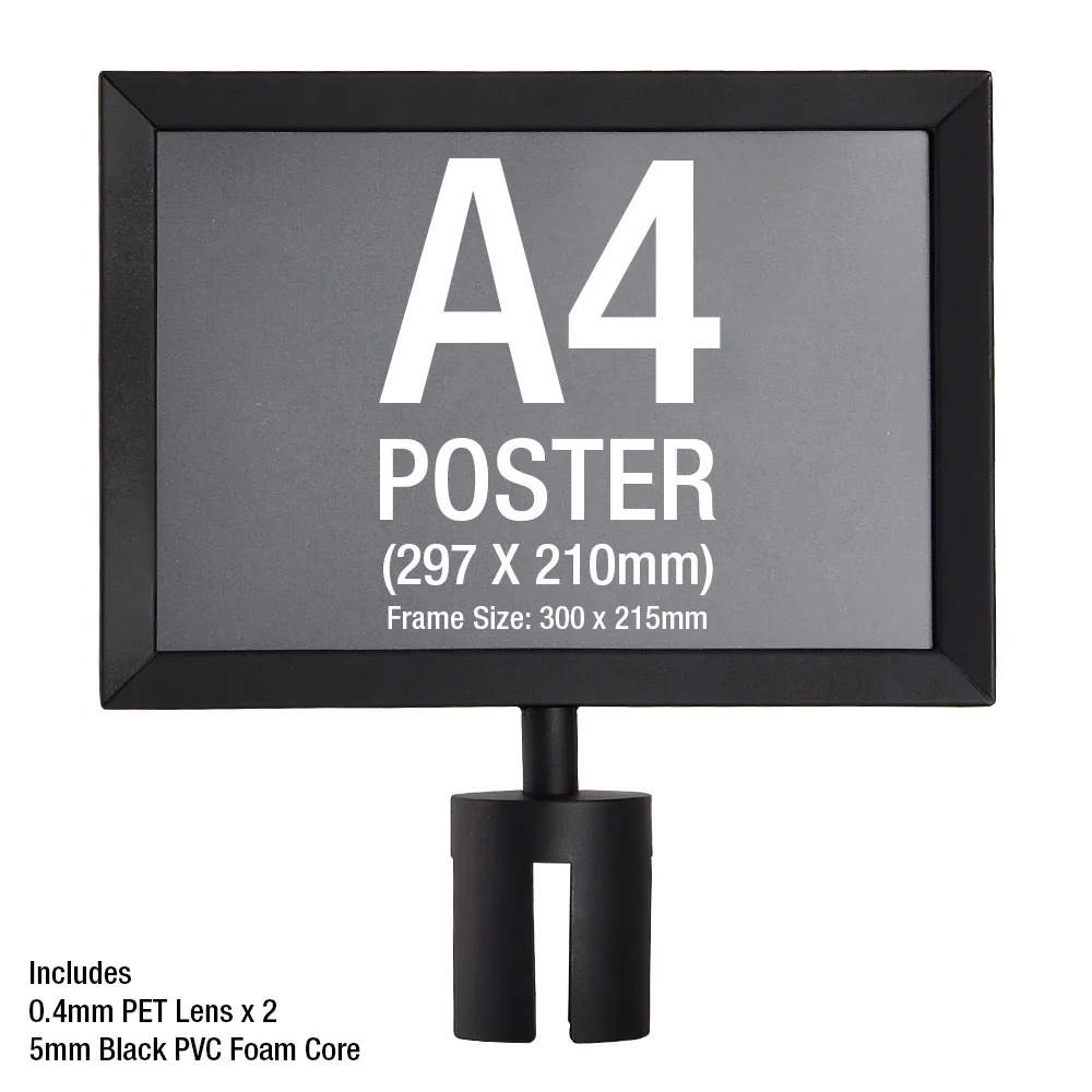 - Matte black double sided A4 sign holder. This is a landscape sign display that suits Q-Line retractable barrier posts