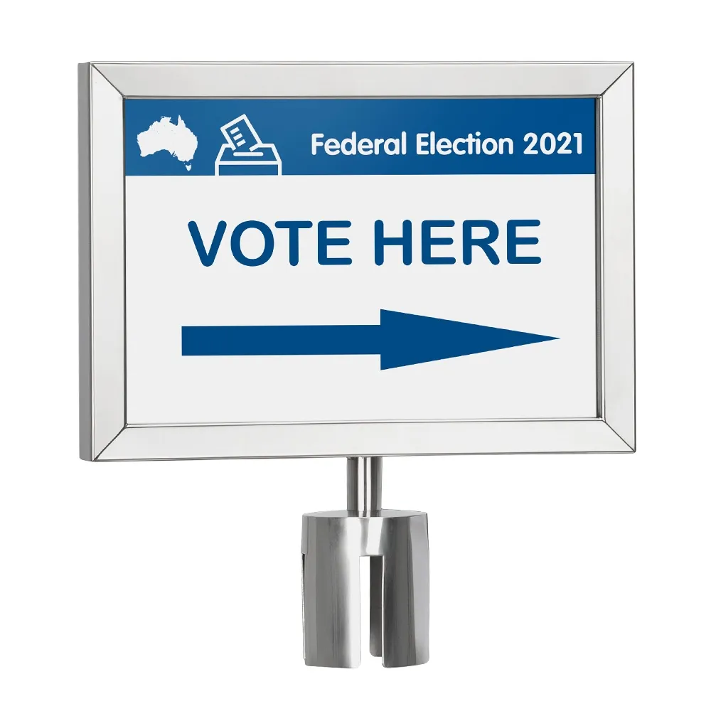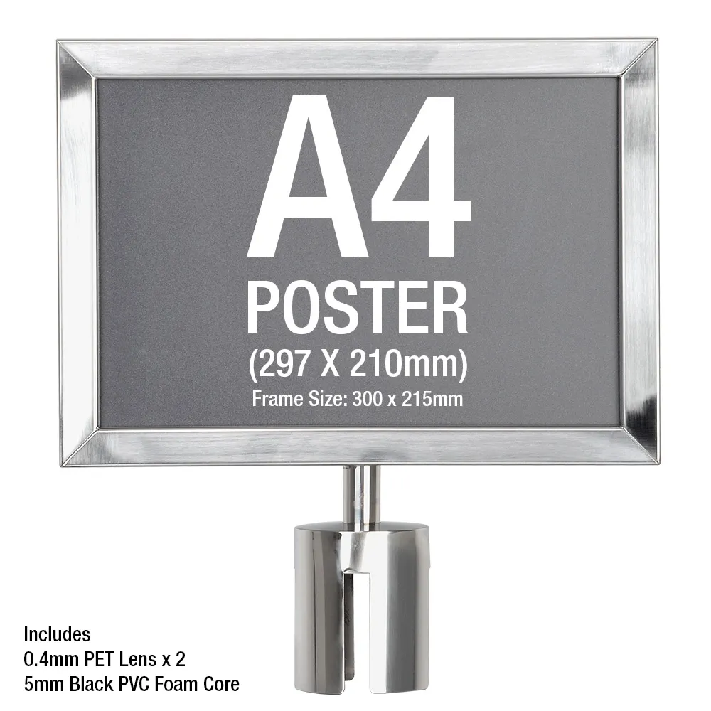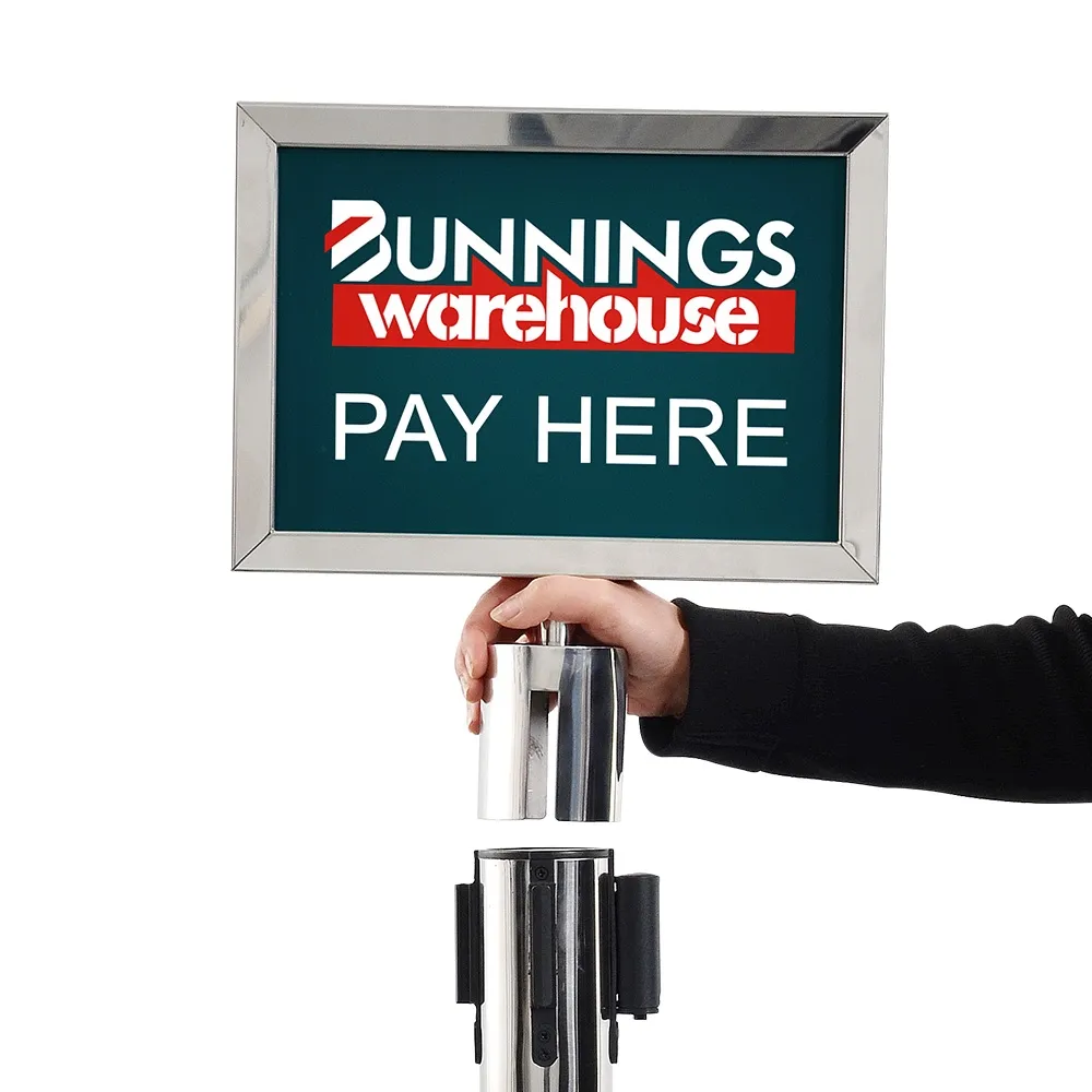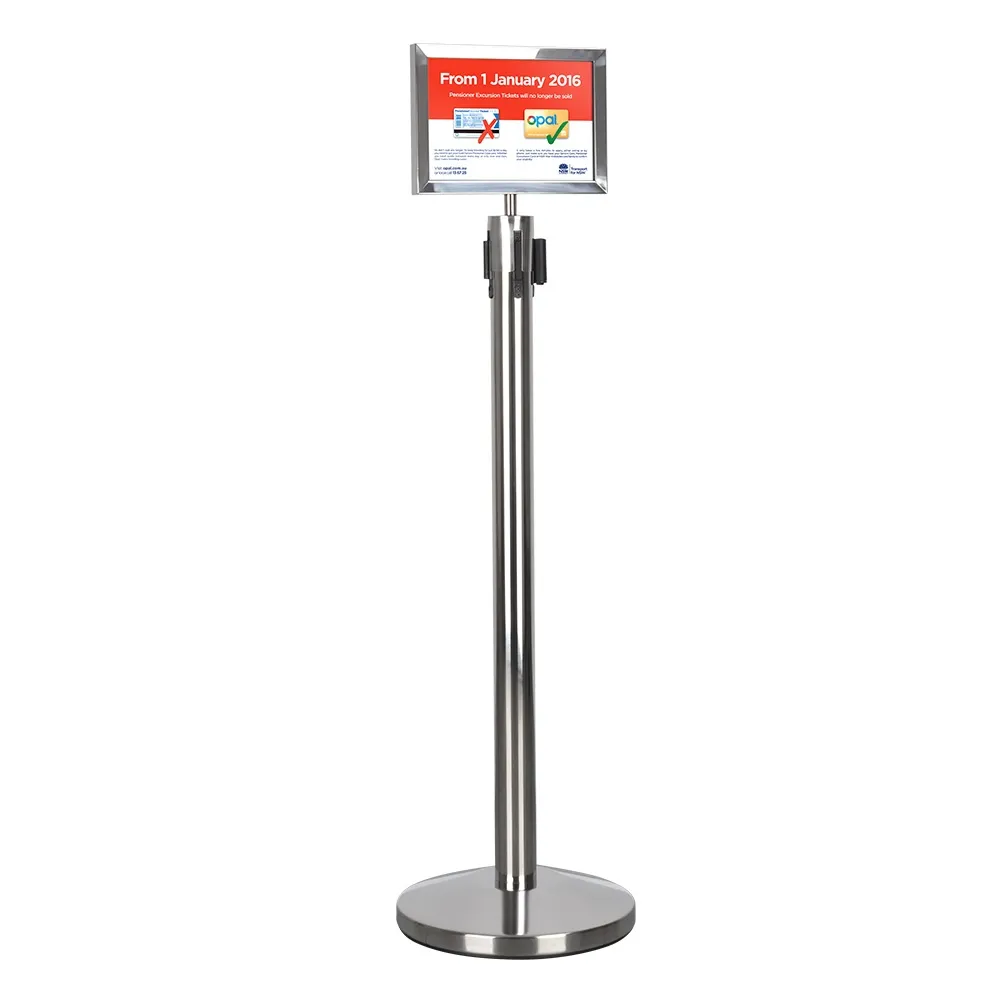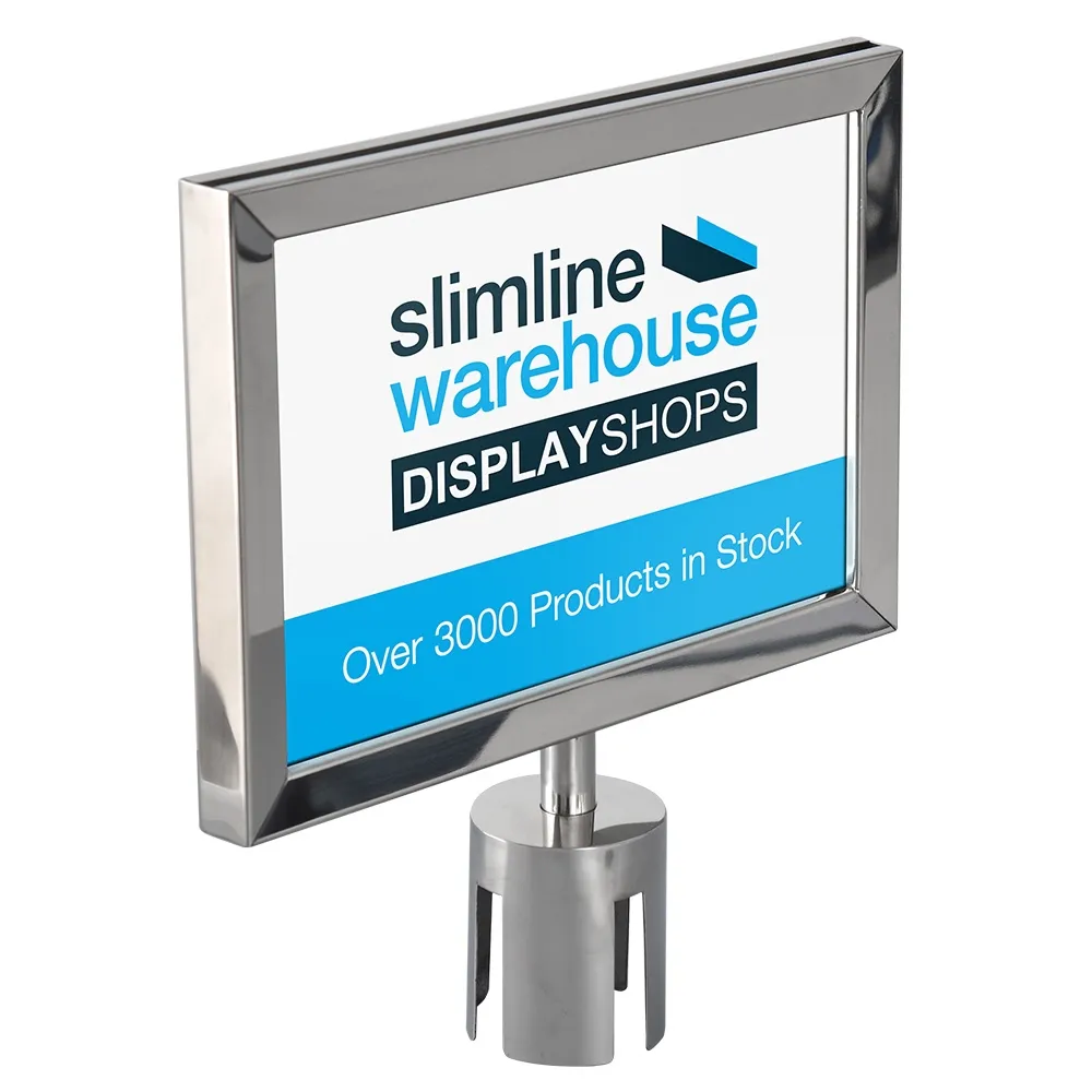 This sign holder holds two posters as a double sided display in landscape format and is used with Q-Line retractable barrier posts. These changeable signs can simply be placed onto the top of retractable barrier posts providing your customers at hotels, exhibitions or tradeshows with important information. With the chrome like finish, these sign holders with suit any posters placed within it.
