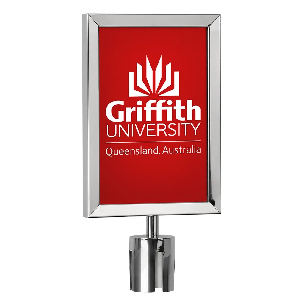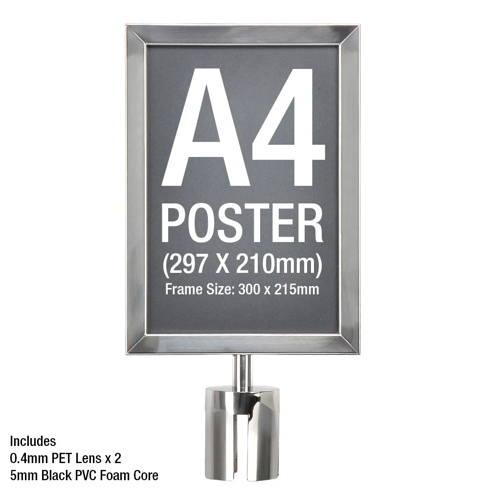 The A4 portrait sign holder is finished in a chrome like finish. It has been designed to compliment advertisements and posters when placed onto your stanchions within your premises.