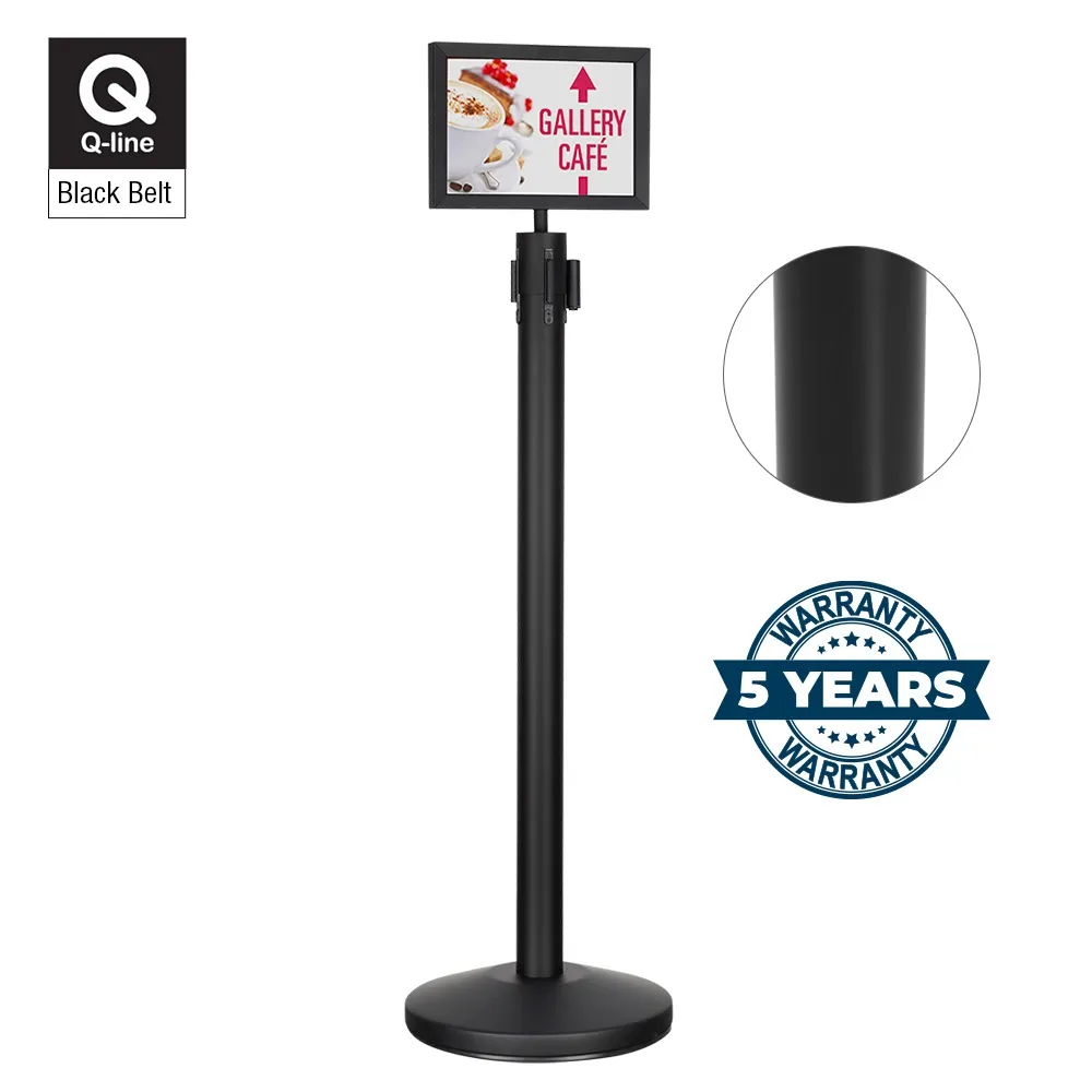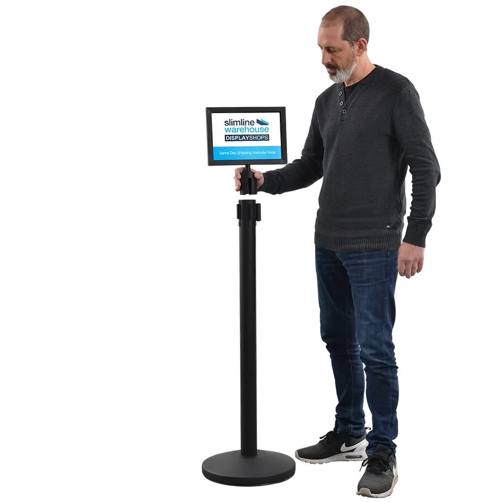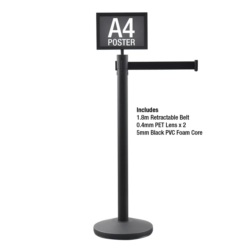 - Double sided black A4 sign holder & retractable barrier post form a free standing sign that can be used with Q-Line barrier posts to organise queues