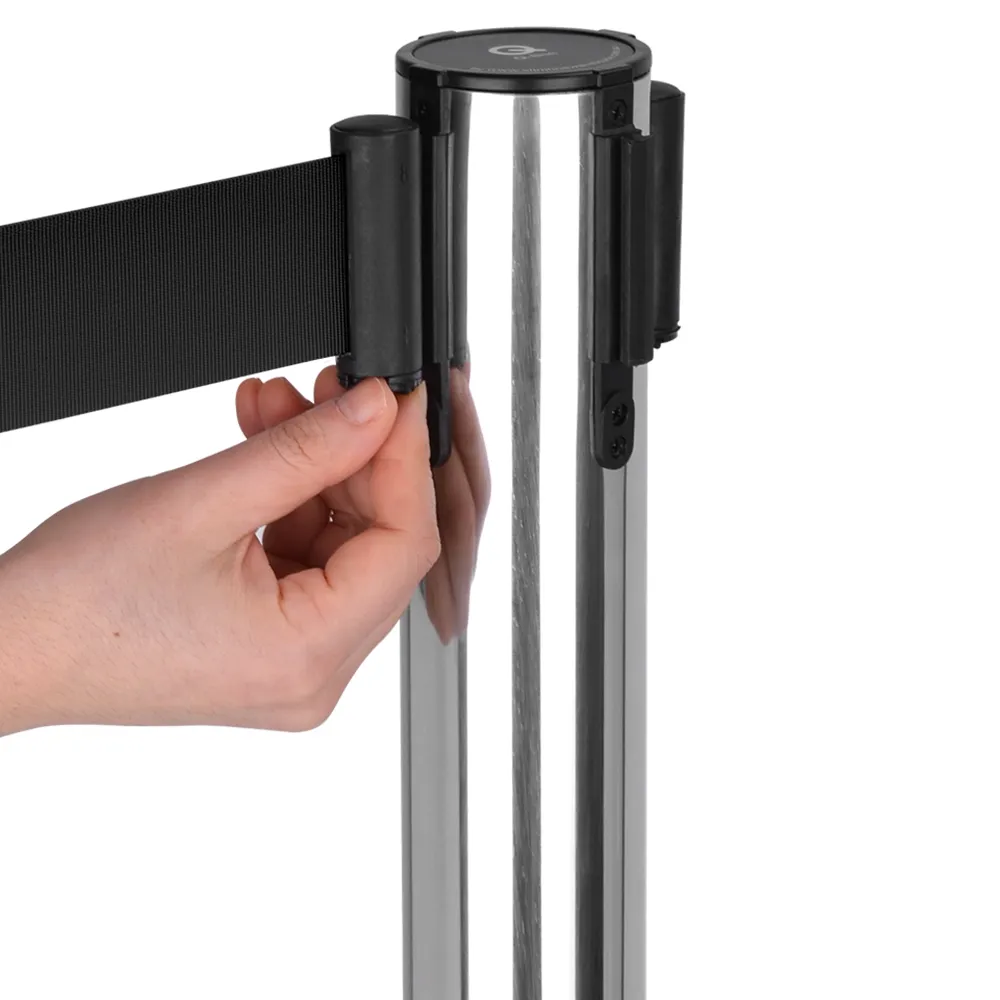 - Retractable black nylon belt extends out up to 1800 mm to attach to clips or posts