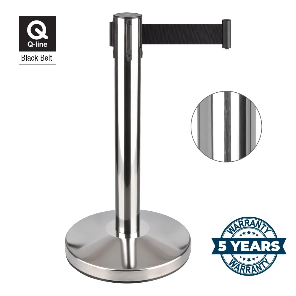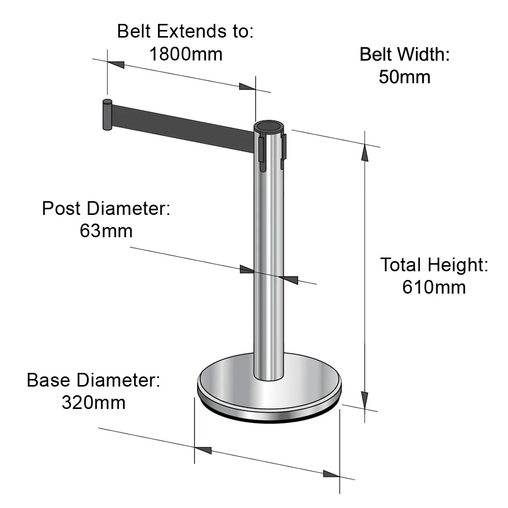 The retractable belt barriers, mini stanchions are a specialised stanchion, standing only 610 mm tall to offer a full view of areas or items that have been sectioned off whilst still offering a clear line where visitors should stay away from. The 50mm wide retractable belt is made of black nylon for strength and easy visibility. The belt extends out up to 1800 mm to easily reach out and attach to other stanchions and clips. The end of the belt features a twist lock to ensure it remains clipped on even if the belt gets jostled.