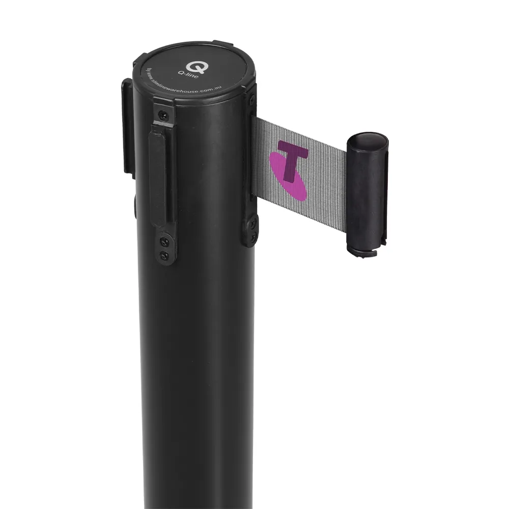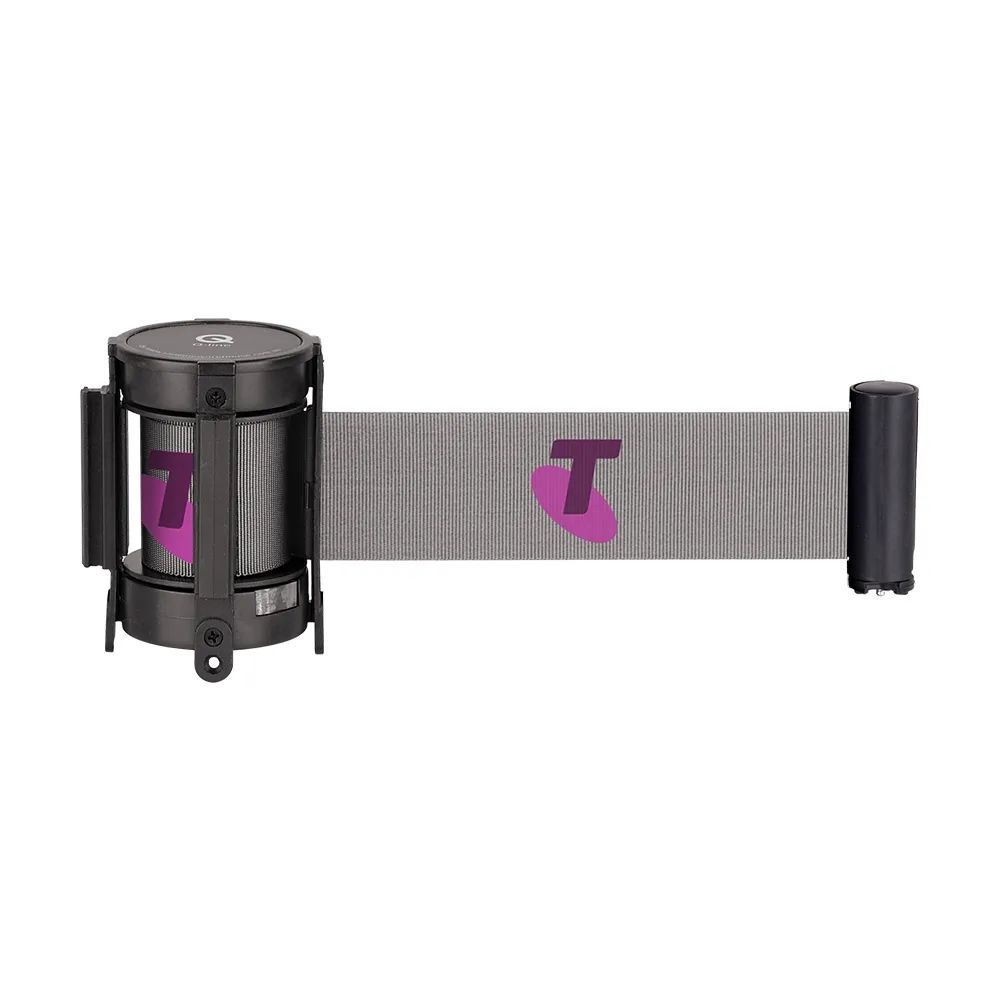 This custom barrier belt uses a digital printing process to show your 2 colour designs on the grey woven nylon belts. These retractable stanchions with printing are dual-sided to maximise exposure and be a more effective marketing tool at cinemas, car dealerships, retail stores, shopping centres, exhibition halls and information centres.