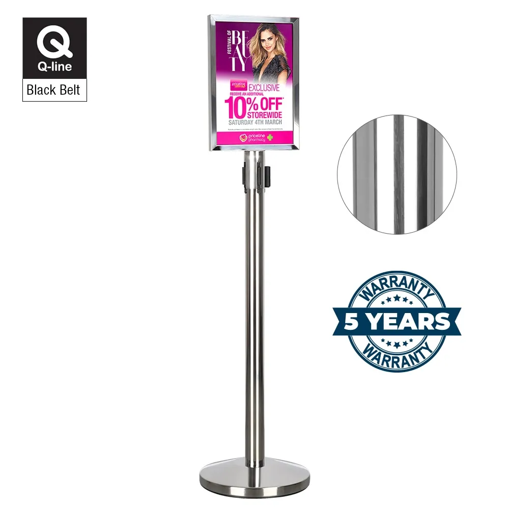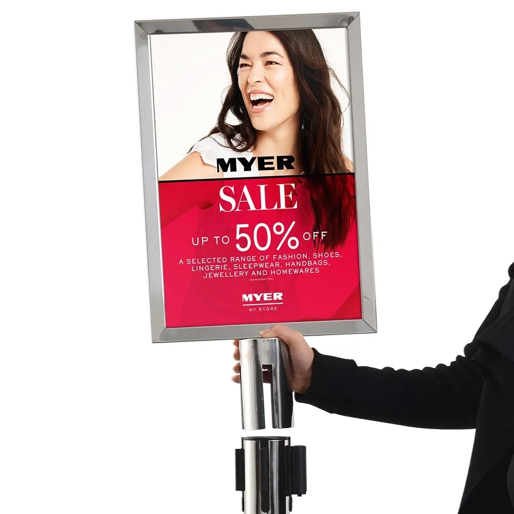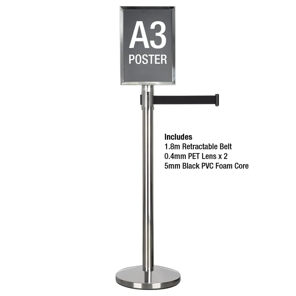 - Polished stainless steel retractable barrier post & A3 poster frame (420 x 297mm)