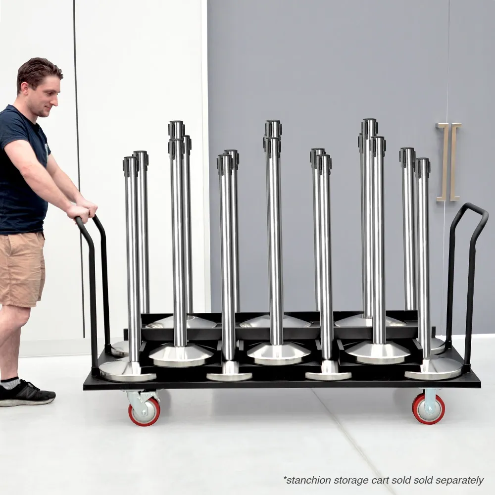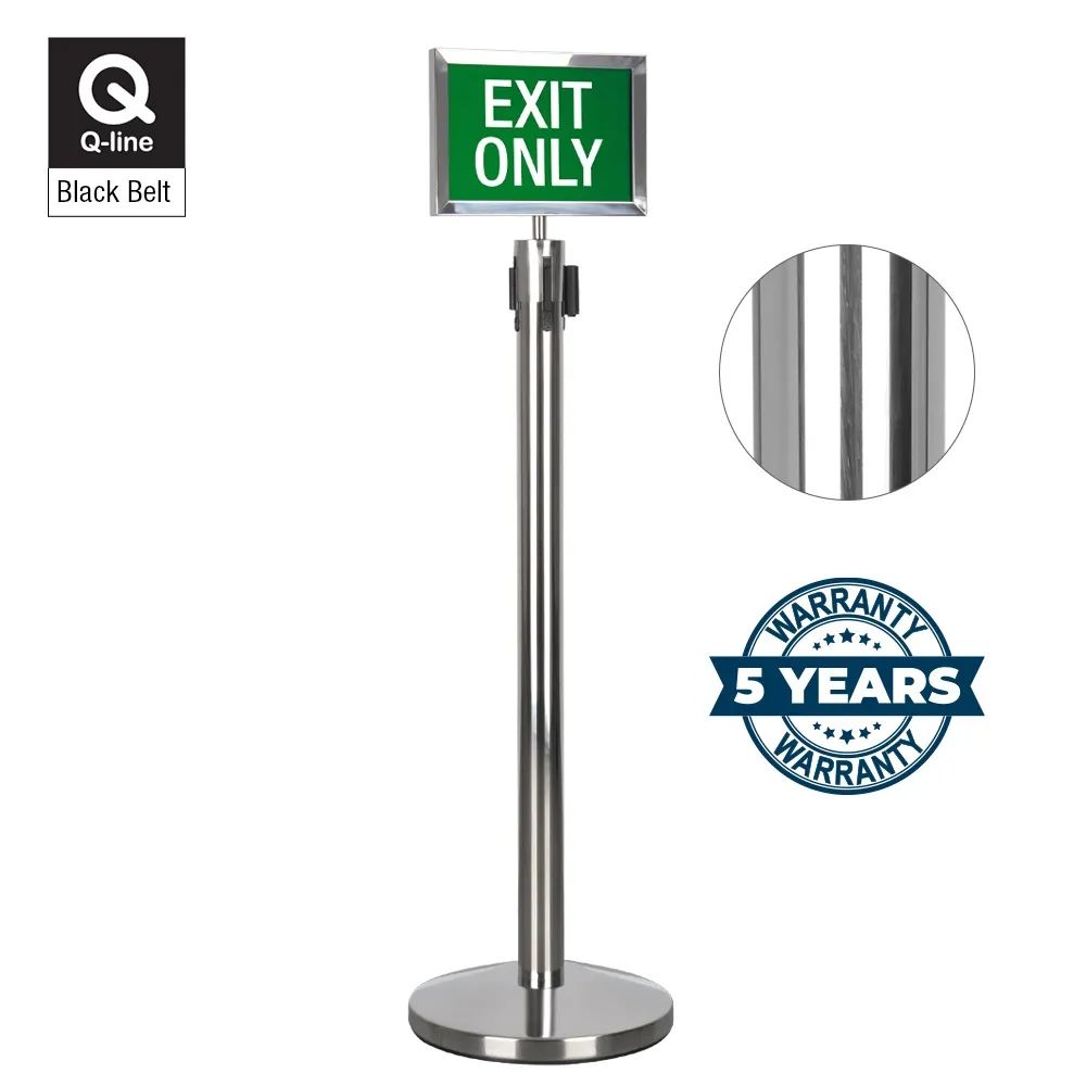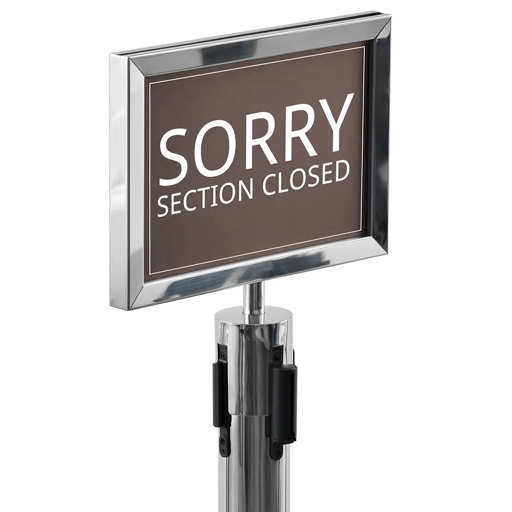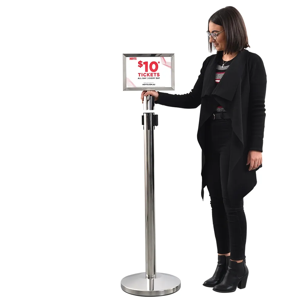 This polished stainless steel poster stand has a high end finish when displayed alone, but also has an 1800mm retractable belt and can be used with other belt barriers or hardware to manage queues, lines or to cordon off areas. The landscape A4 frame holds two posters back-to-back for double sided advertising and simply slides on or off the top of the belt barrier post