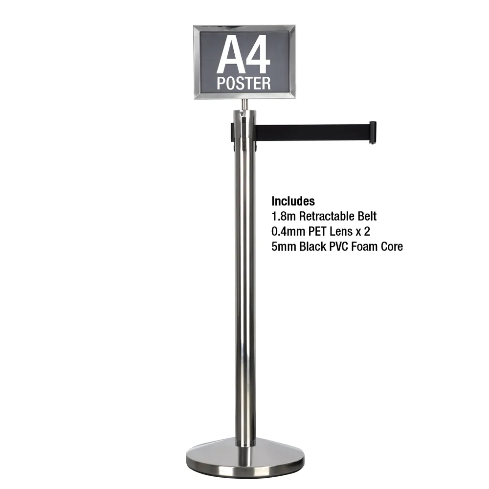 - This free standing sign is comprised of a double sided A4 frame & Polished Retractable Queue Barrier & can be used as a stand alone poster stand or as part of a queue management system