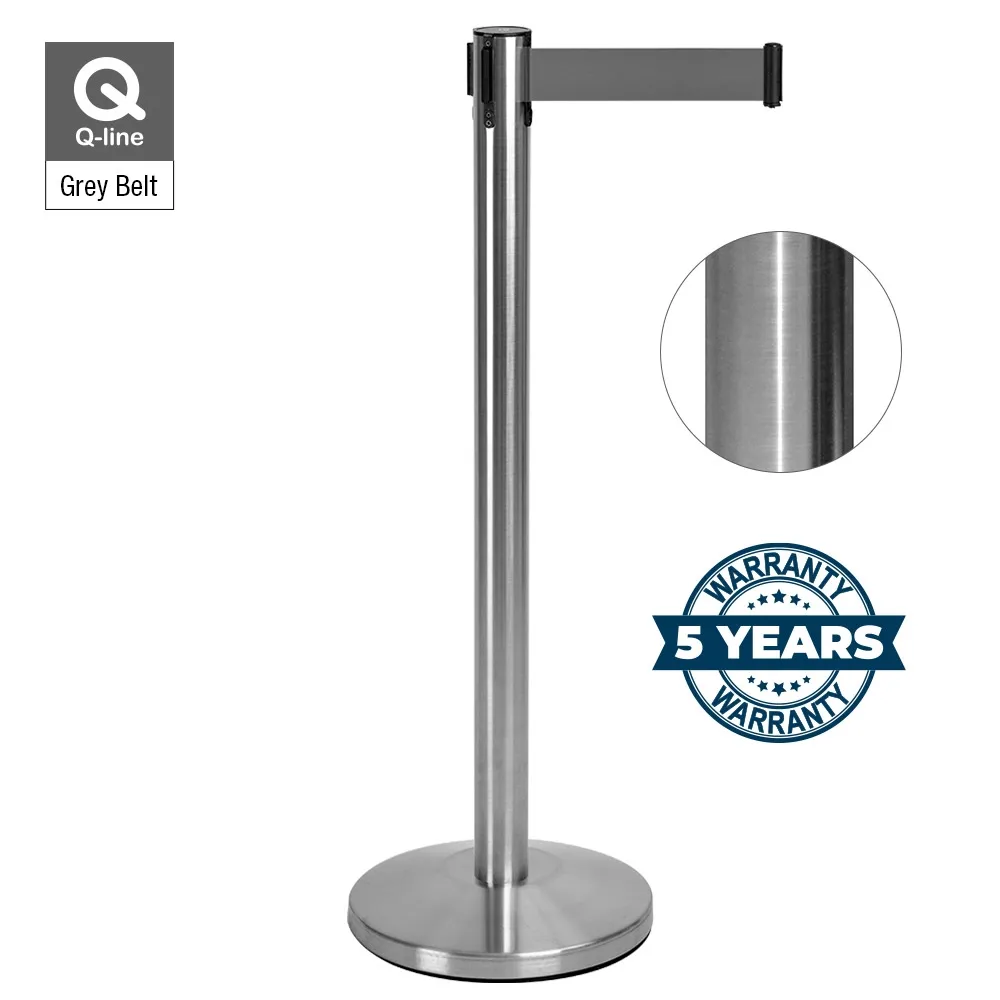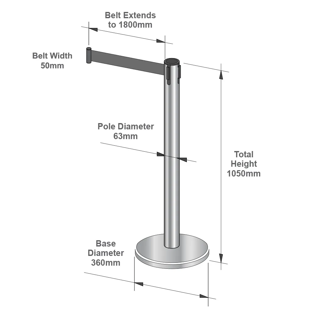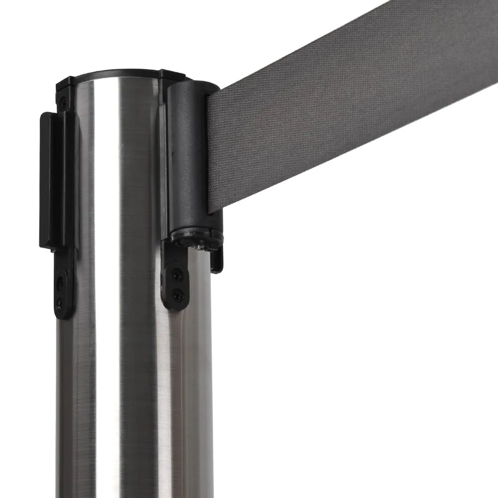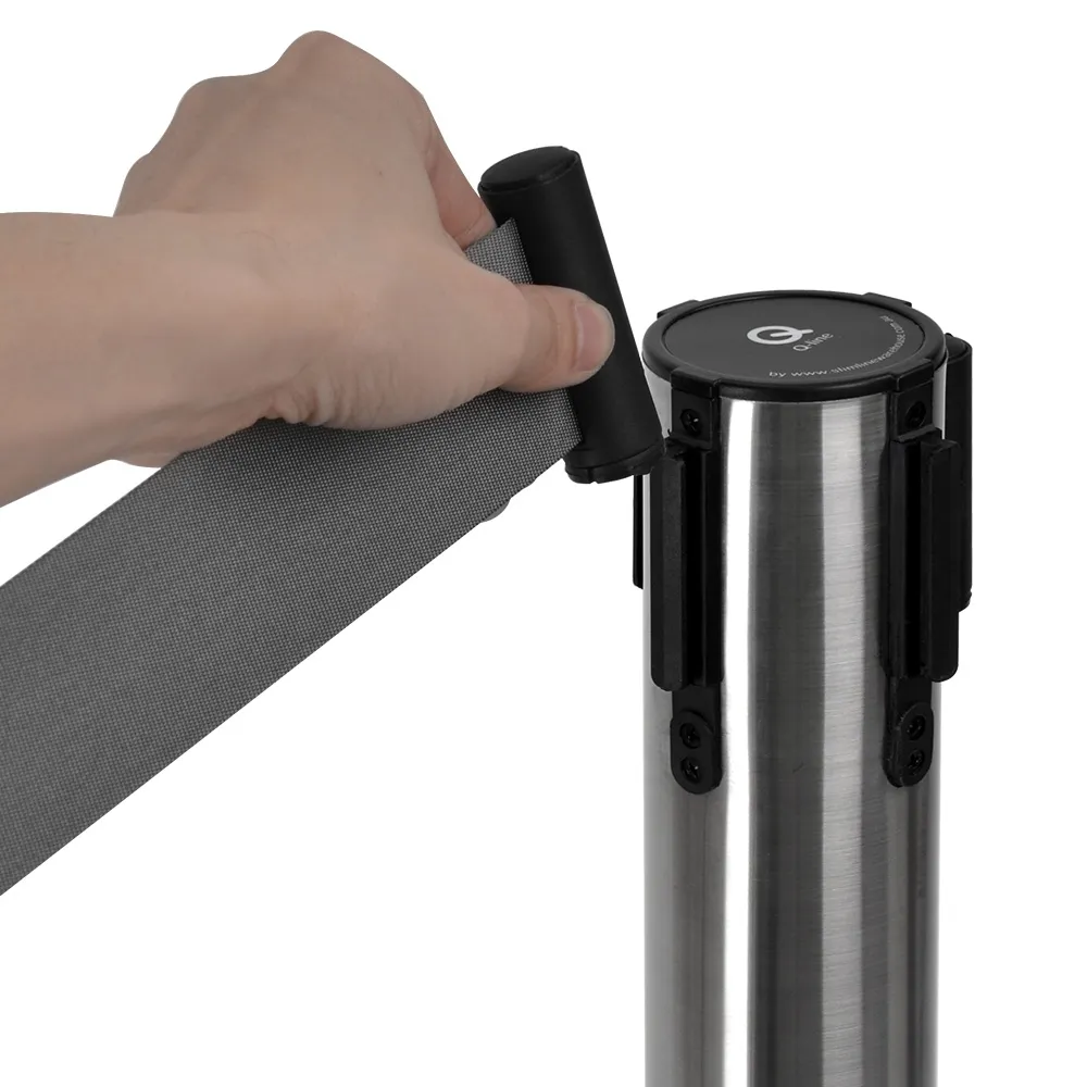 The stanchion post, like a queue control barriers, features a retractable belt that extends out up to 1800mm to make attaching the clip to a wall or other stanchion easy. A retractable belt makes it easy to set the stanchions up in different areas at your desired position. The end of the belt has a twist lock that helps it stay attached to bollards or wall clips even if the belt is pushed. The 50mm wide belt is made of grey nylon to be hard-wearing whilst working with every style.