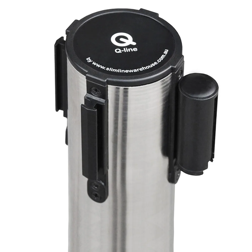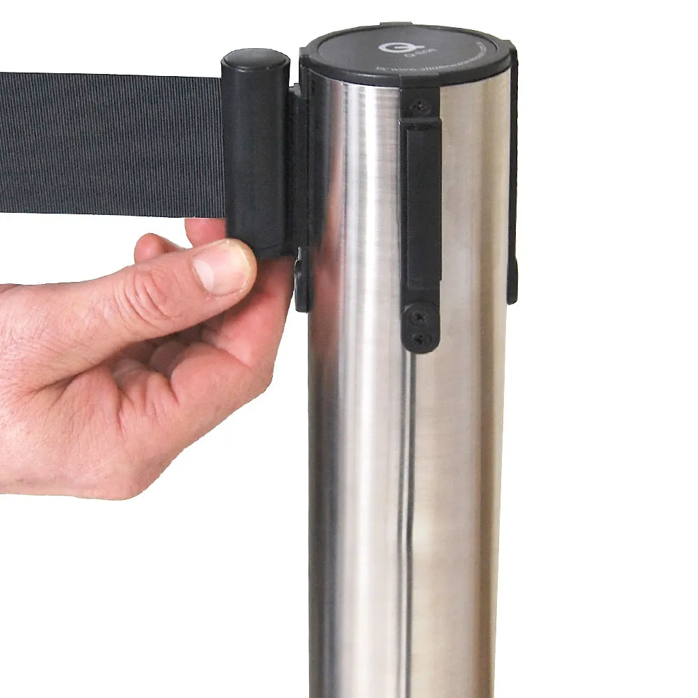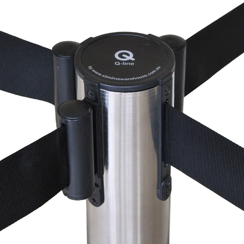 - Each retractable barrier head is equipped to hold up to 4 belts from the one pole. Create lines or queues in any configuration.