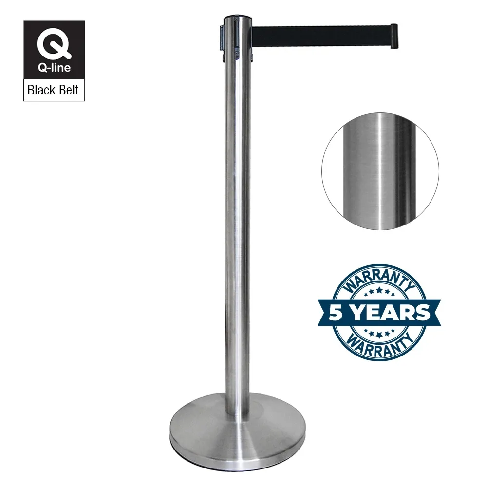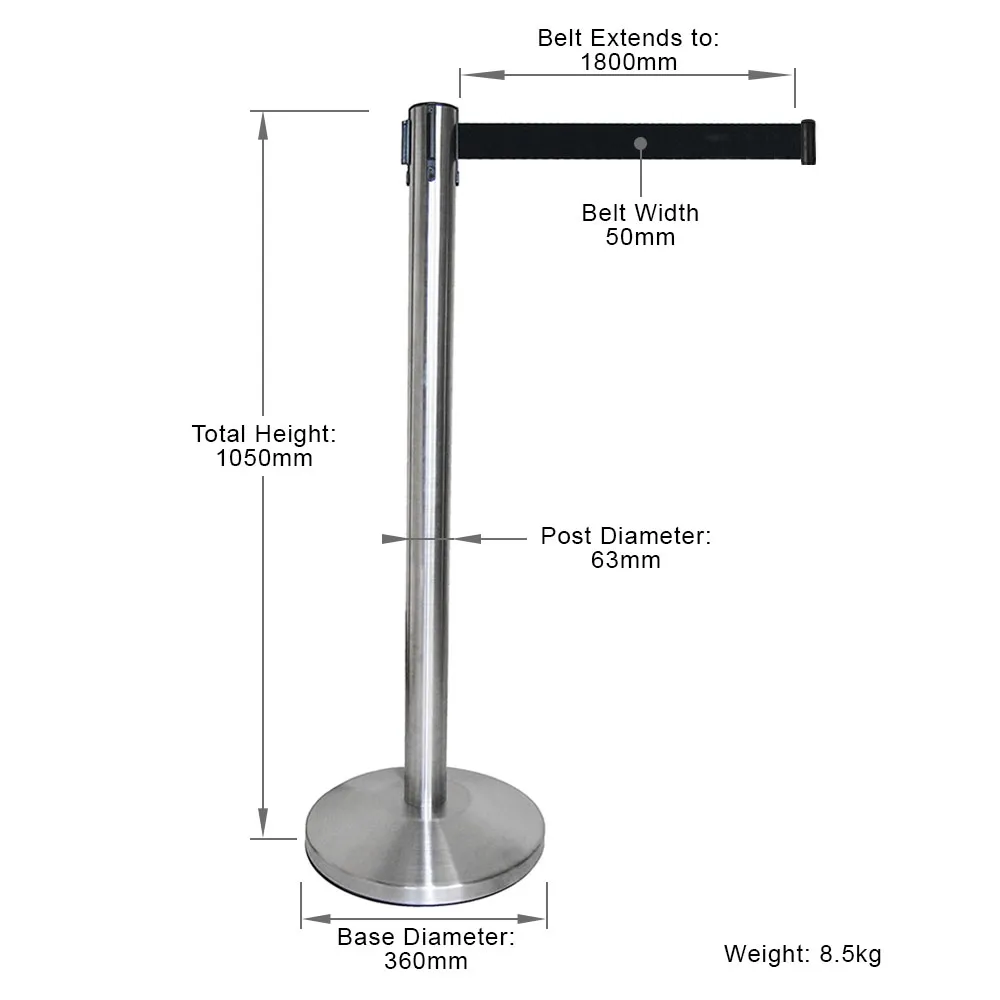 - This unit includes a 1 metre tall post brushed steel post and a 1.8 metre long nylon retractable belt. This unit also includes a 5 year warranty. All for the price that you may pay elsewhere for a single stanchion!