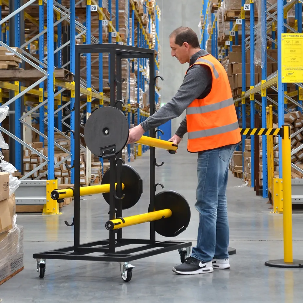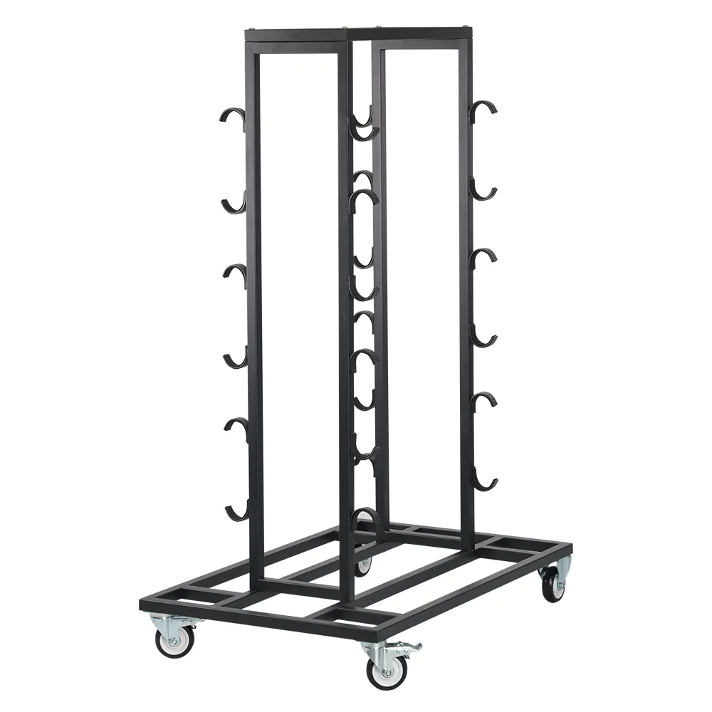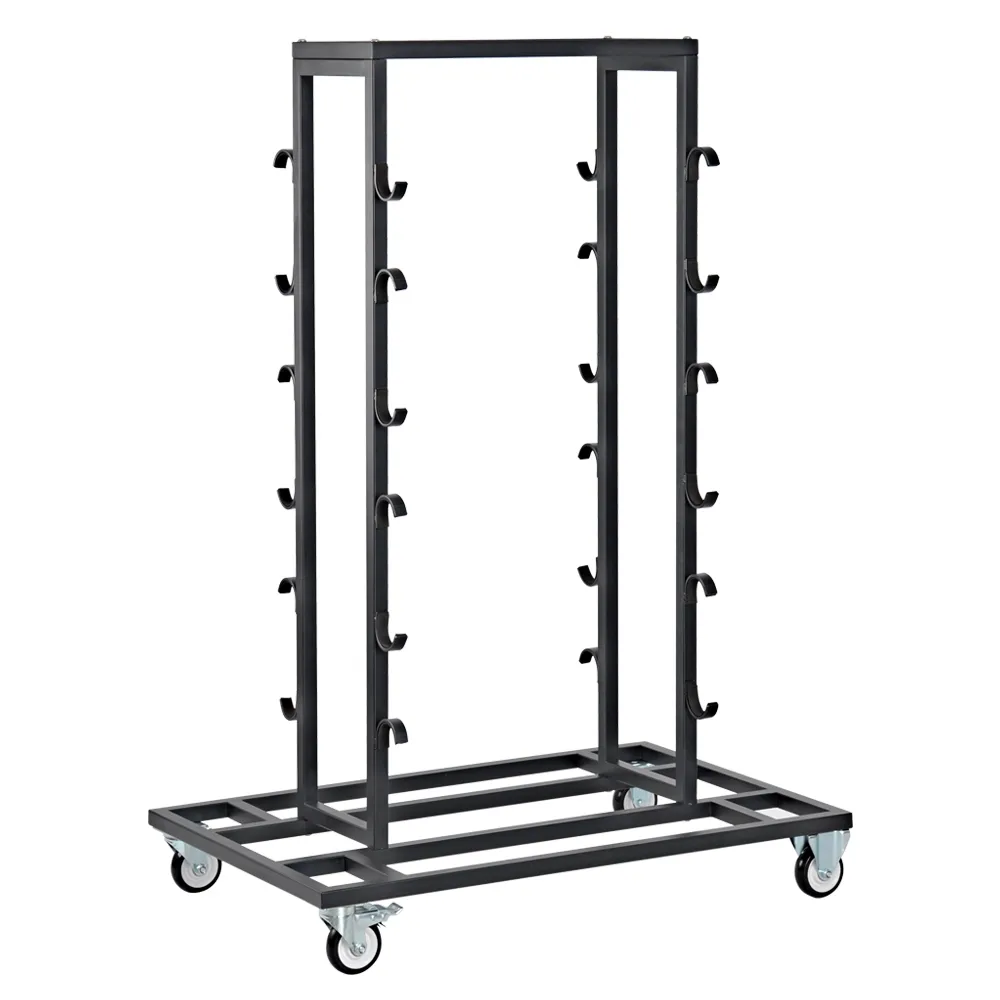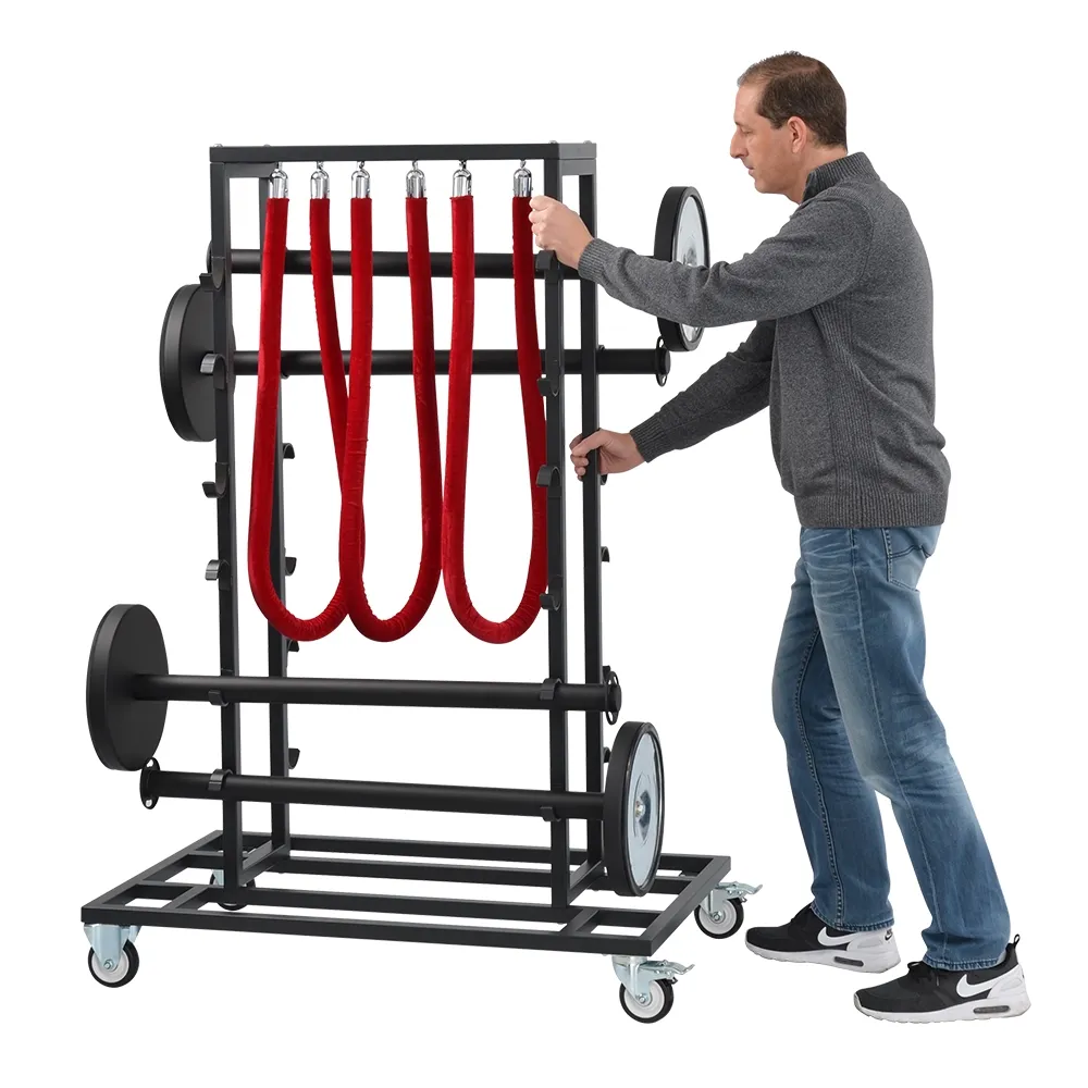 - Stanchion storage cart holds up to 12 posts on padded hooks to prevent damage