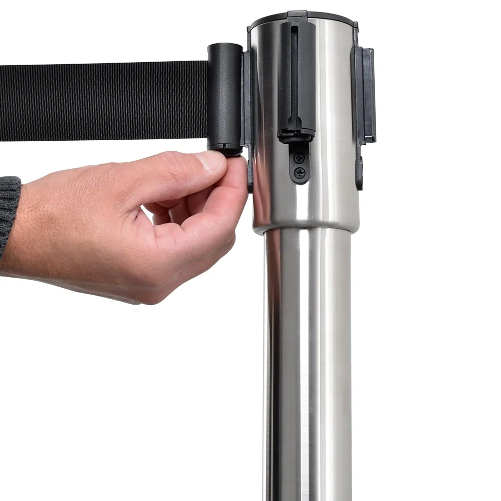 - Retractable belt stanchion has 2m long hard-wearing nylon belt to connect to posts