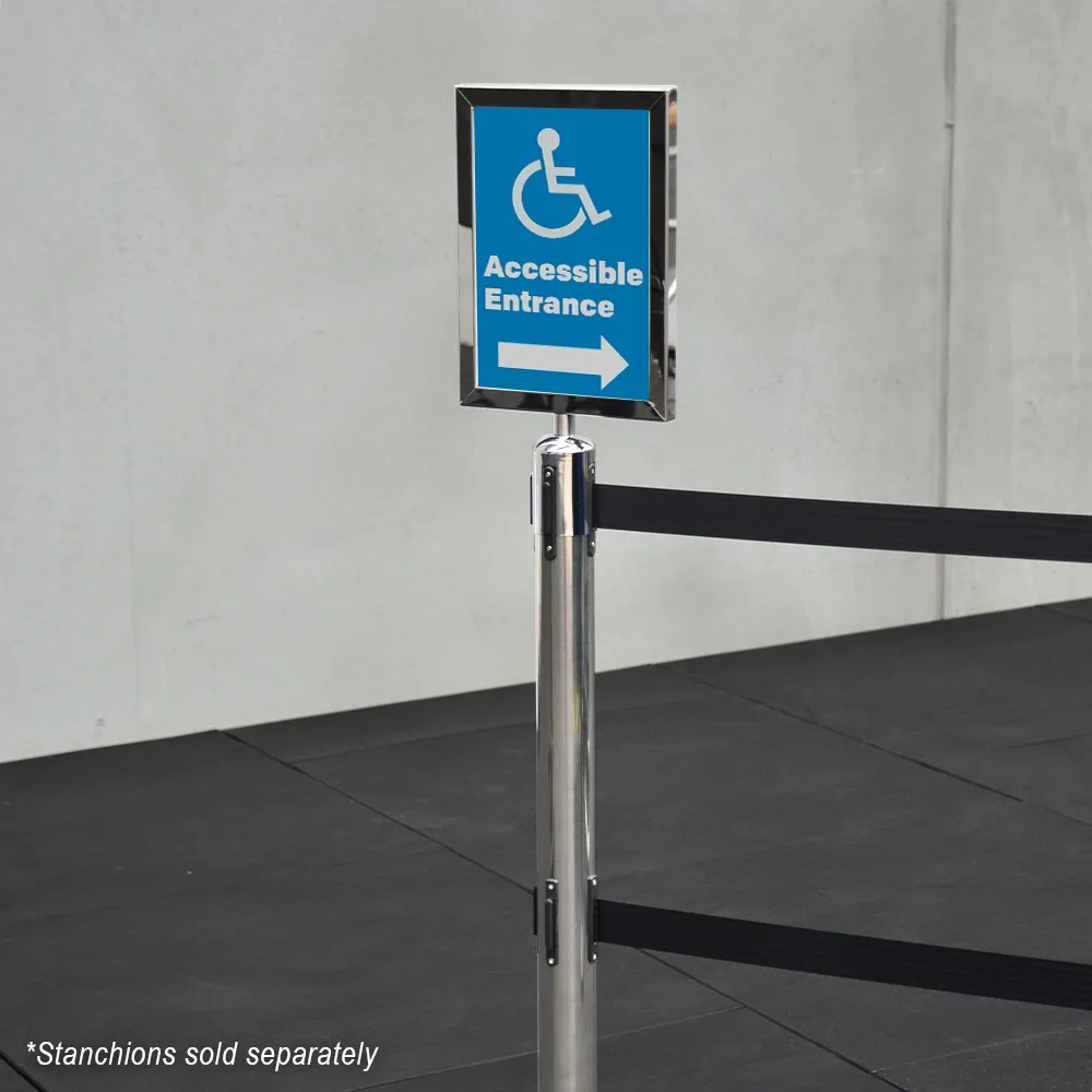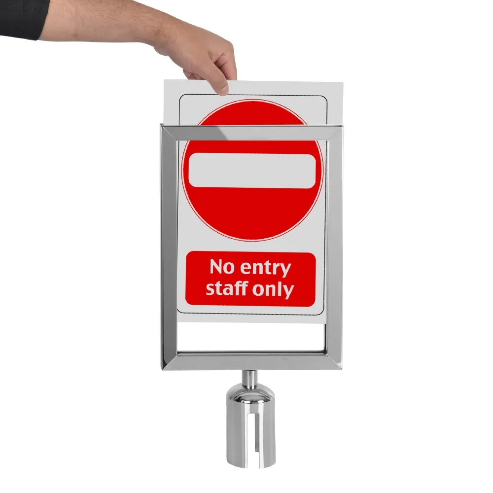 A stanchion sign topper, like this barrier post frame, works with a range of different retractable belt barrier posts. The slide-on design securely attach to the top of each post, with cut-outs that still allow easy access to the belt and the receiving connectors. The frame is made from metal with a polished chrome finish that offers a professional appearance that complements any décor or barrier post without issue. Slimline Warehouse provides same day shipping to anywhere in Australia with this and most other in stock products if in stock, buy online today for fast dispatch to you!
