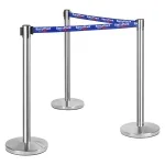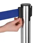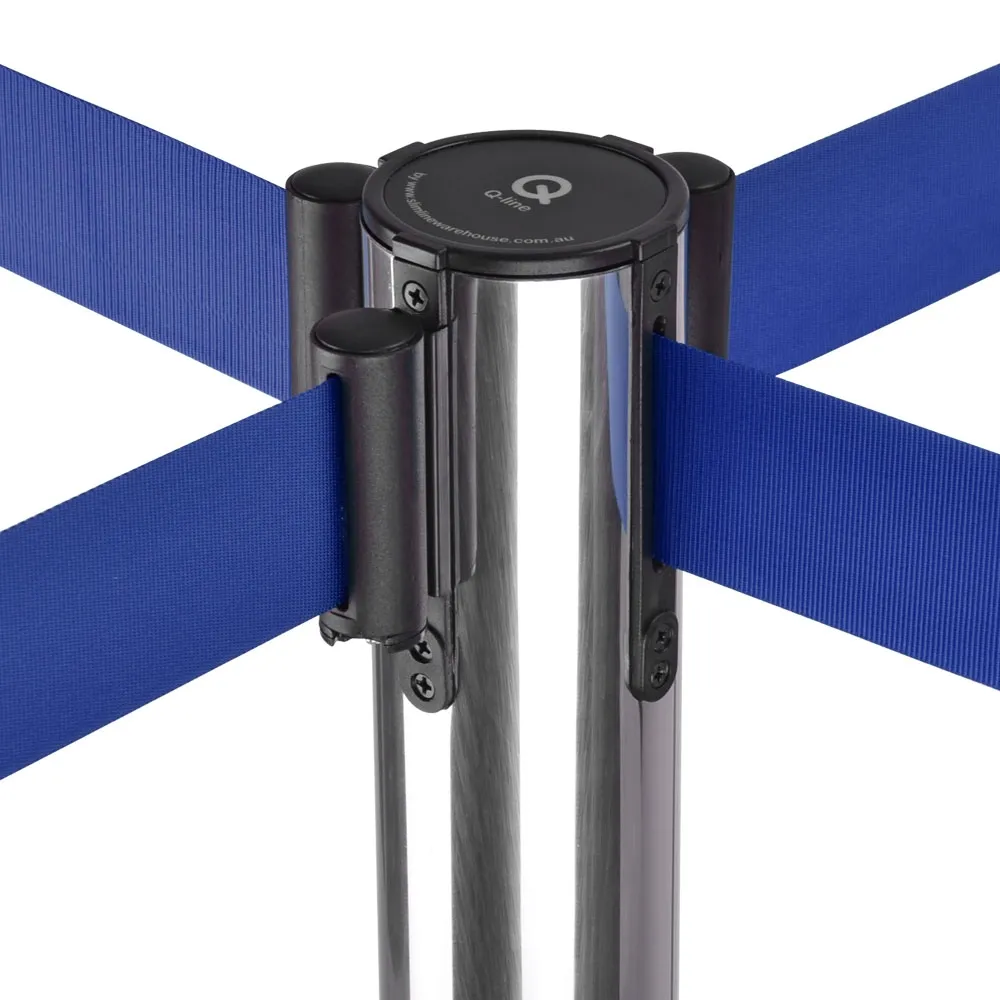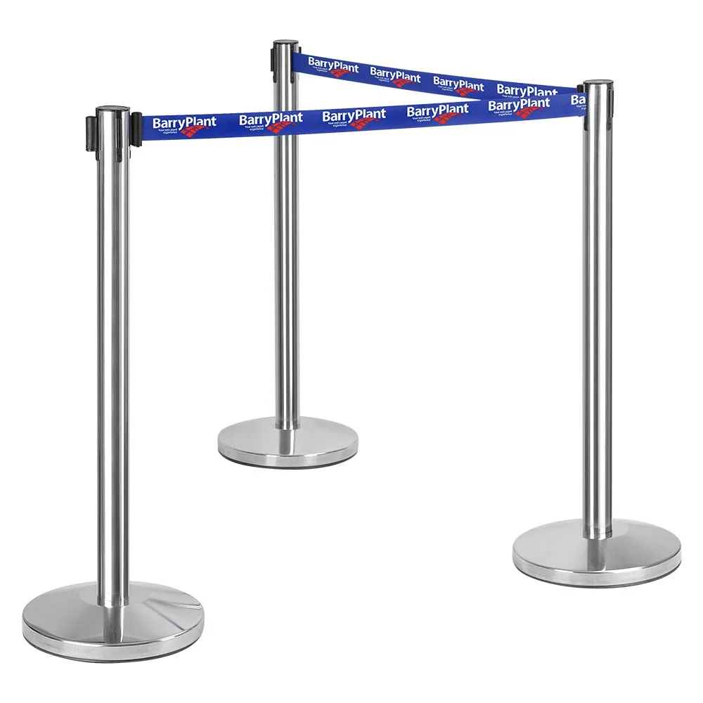 Stanchion poles have a retractable belt that has custom designs printed in 2 colours on both sides of the barrier to advertise to people visiting or waiting in a queue. The crowd control posts use a hard-wearing 1.8m long woven nylon belt with a blue colour for high visibility in any location. The top of the post has a 4-way adapter to easily connect with belts from different directions to section off areas.