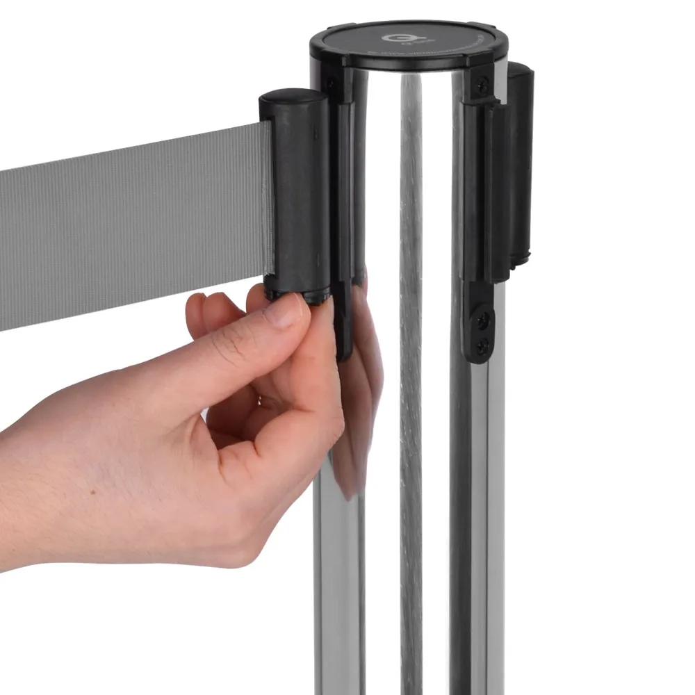 - Retractable tape barrier has 1.8m long woven nylon grey belt to easily reach other posts