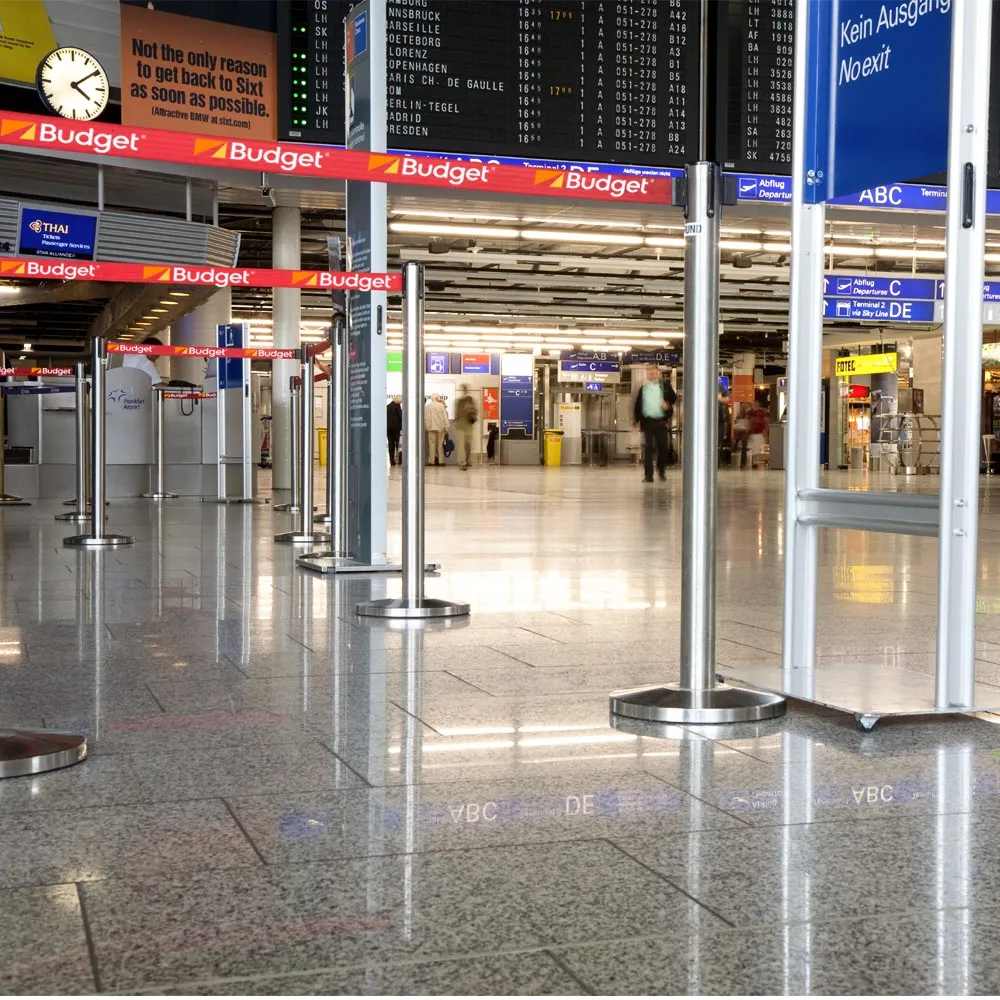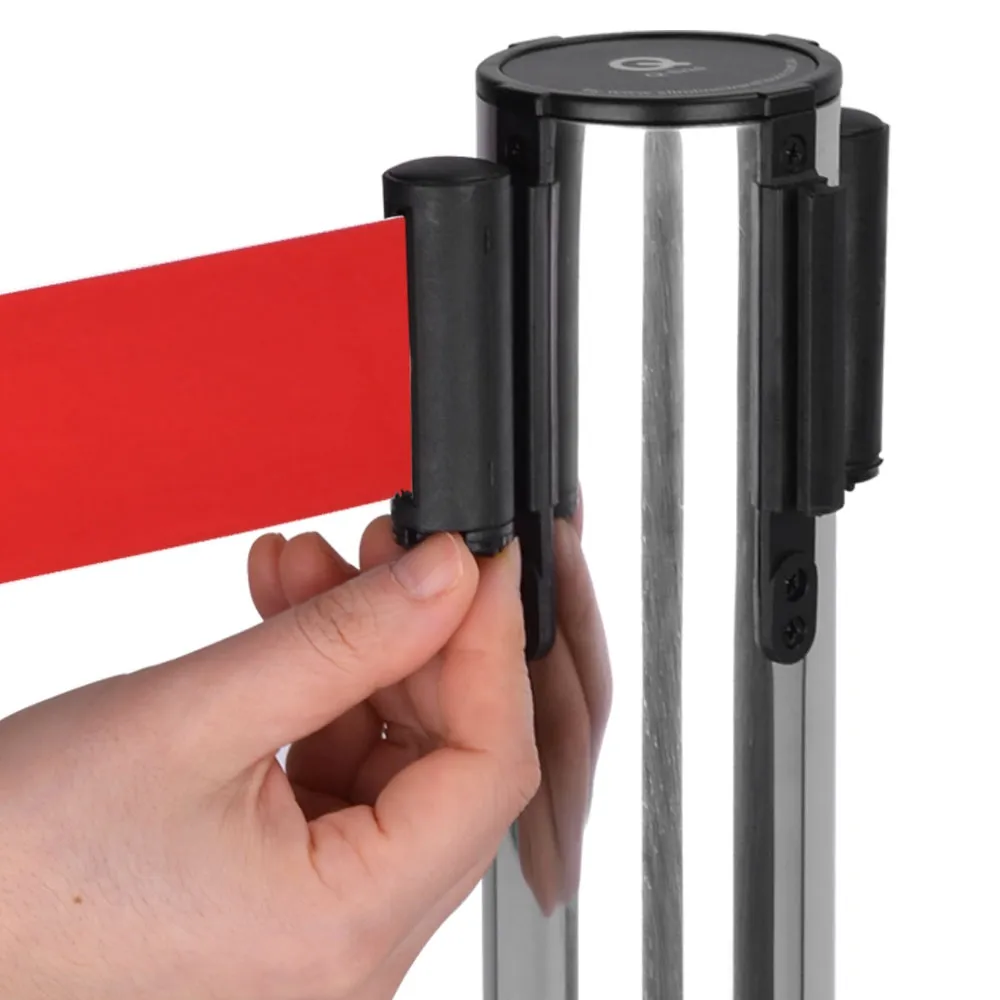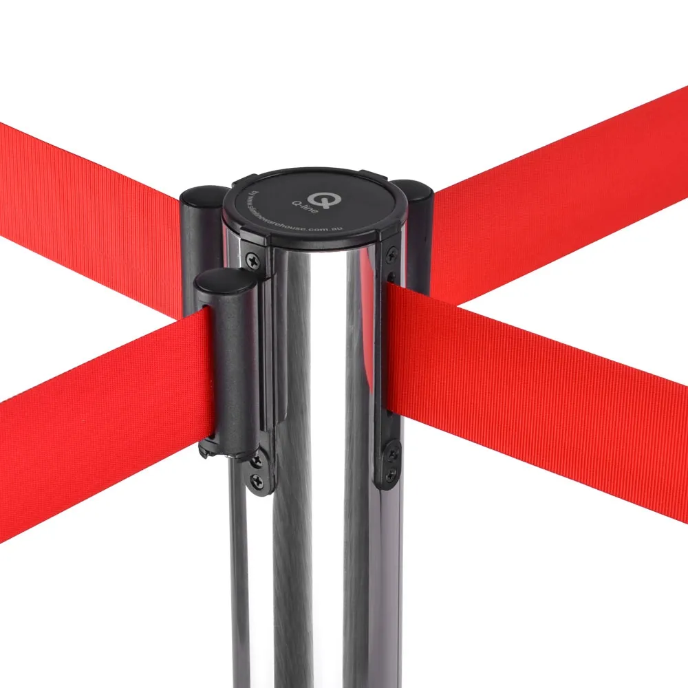 The retractable tape barriers ensures stability by using a weighted base that has also been rubberised, helping to protect floors from getting scratched during use. The barrier belt posts are made from stainless steel for strength, and assembly without tools as the base & post screw together easily. The adapter on top of the stanchion allows for connections in 4 directions to make setting up a queue or sectioning at your cinema, museum, airport, exhibition hall, retail store, shopping centre, train station, and more!