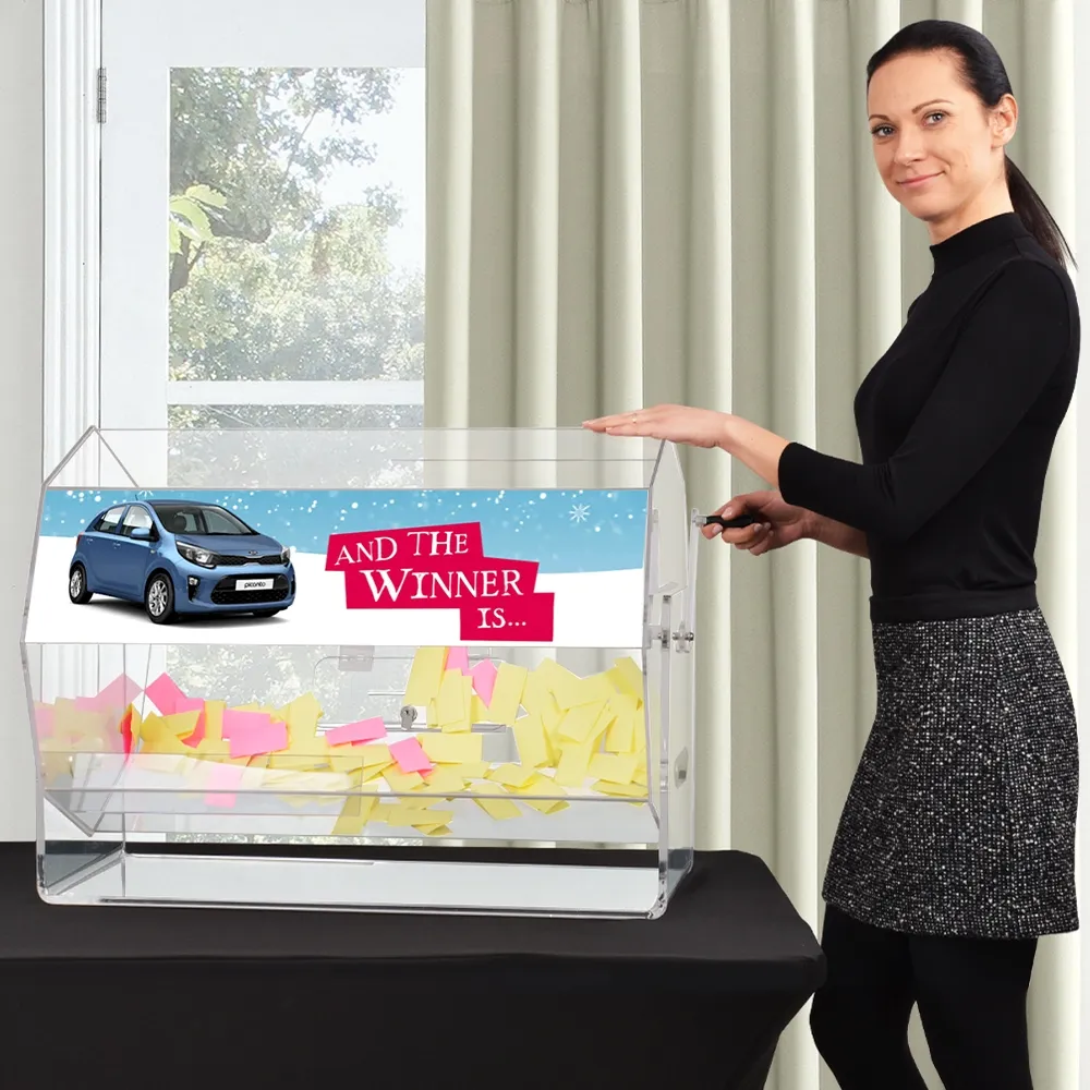 The large acrylic raffle drum, one of many available clear plastic displays, is made from 5mm thick perspex that combines durability with a great look that provides a full view of the container contents to show games aren't rigged or encourage others to donate after seeing so many already have. There are (2) custom printed signs included that take up an entire side of drawing barrel. Each graphic is 185 x 710mm and are digitally printed to provide full colour signs that are true to your design. Using a competition barrel with signs helps to better get visitors and employees interested in what's on.