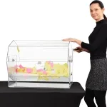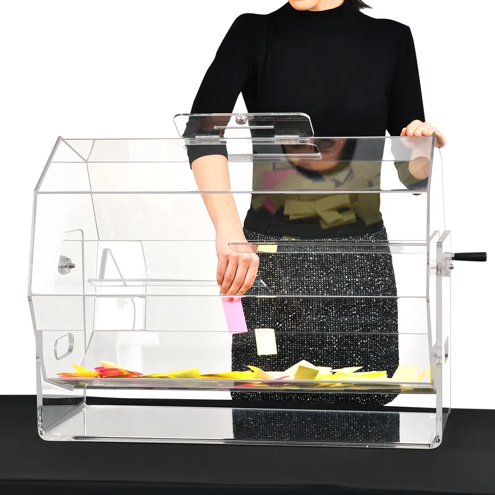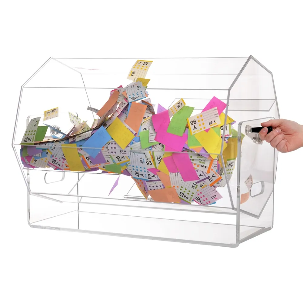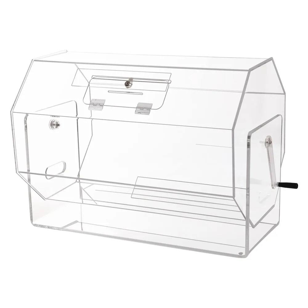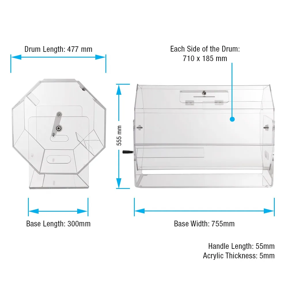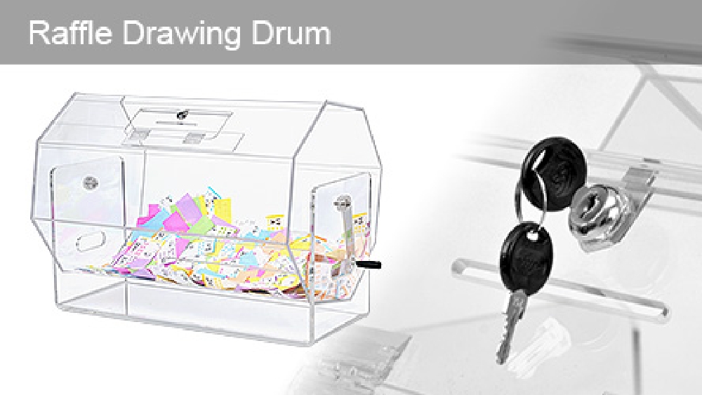 This raffle drawing drum can be used to create a fun atmosphere at corporate parties, fundraisers, charity events, and more! The clear acrylic drawing drums spin 360°, with a handle on the side making it easy to turn the barrel and mix up all the contents for a random draw. The ticket drum is made from 5mm thick clear acrylic, providing a full view of the interior to entrants whilst offering an affordable display for long-lasting use.