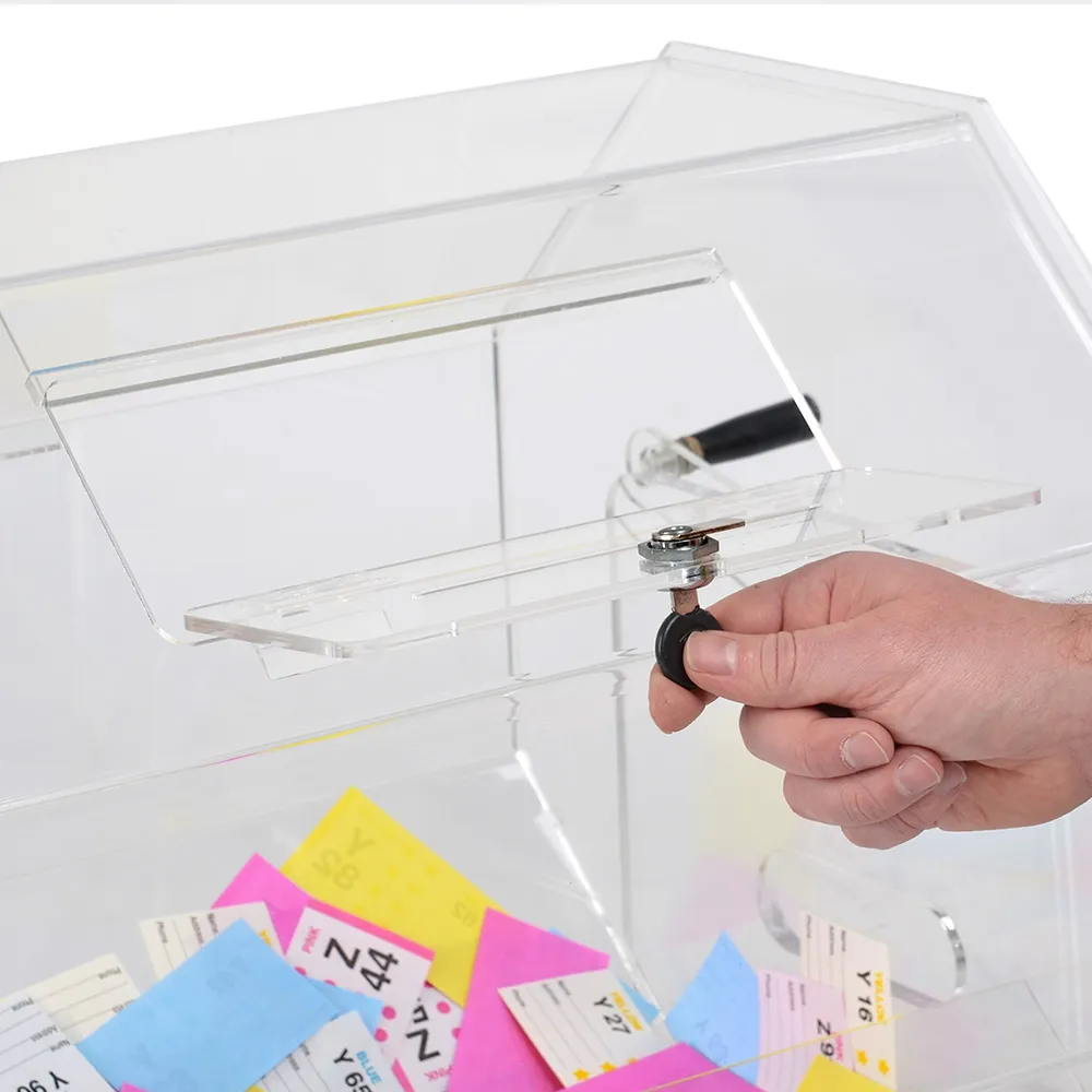- Raffle ticket tumbler is made of 5mm thick clear acrylic, providing full view of tickets inside!