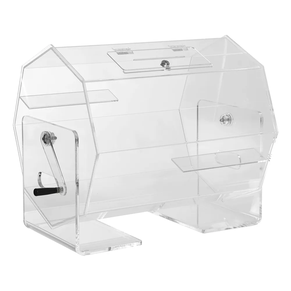 The raffle ticket tumbler, one of our many acrylic displays, is made from 5mm thick clear acrylic, offering both durability and a full view of contents within the drum. The barrel is lockable as well, ensuring access to the interior by only employees with a key and through the 152 x 5mm slot in the top where tickets and entries can be placed. The hinged 258 x 95mm door swings open once unlocked to easily remove tickets to pick the winner and empty it out once done.