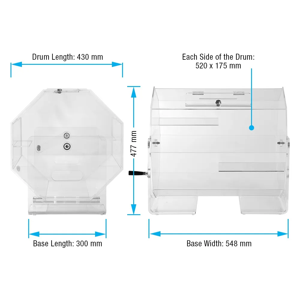 - Barrel has 152 x 5mm slot for easy insertion of ballots, tickets, and more