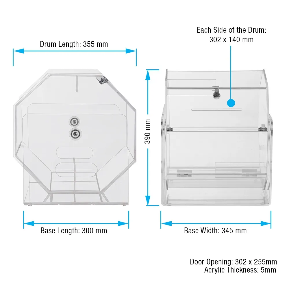 - Raffle ticket drums are made from 5mm thick clear acrylic for full interior view