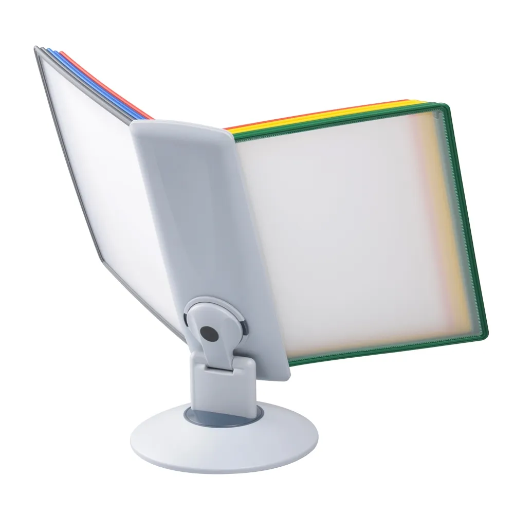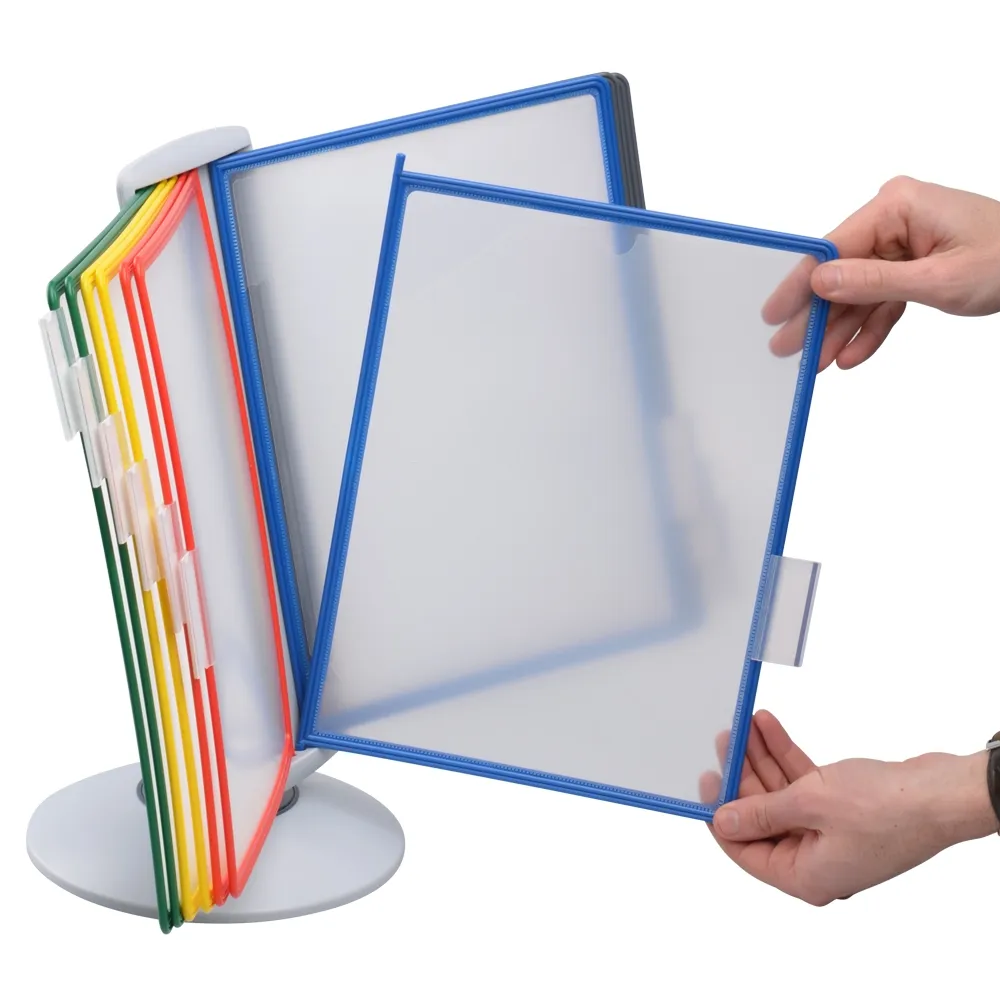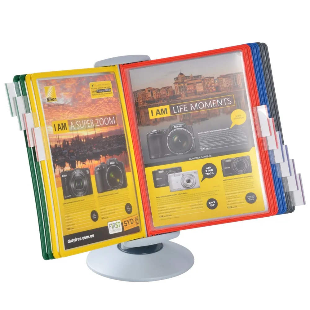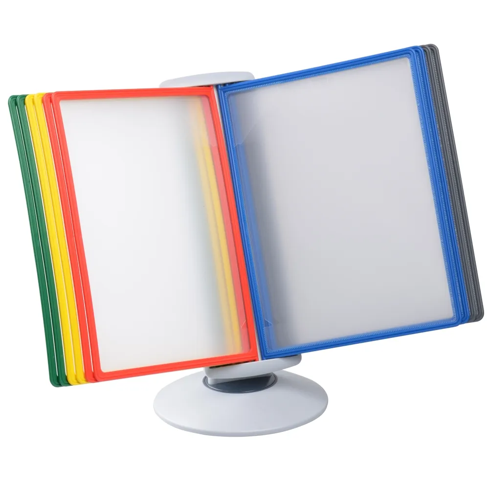 A desktop reference system is a great way to organise a variety of different documents for easy viewing by visitors, employees, and patrons. The document flip stand has (10) sleeves for placing these documents, with A4 (210 x 297mm) standard sized items being the perfect fit. You can place your A4 graphics in landscape or portrait orientation, as the entire display easily goes between formats for easy reading. There are multiple colours of pockets to allow coordination between references to make it easier for users to find what they are looking to view.