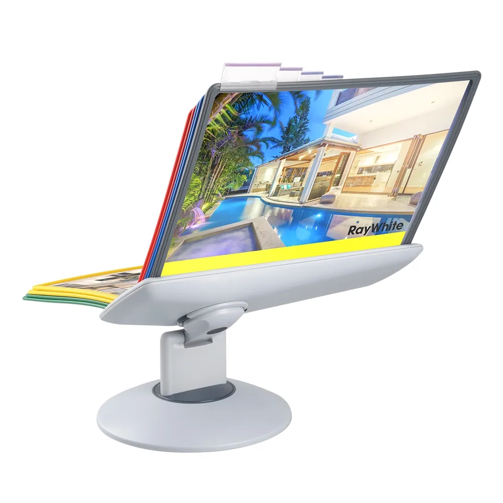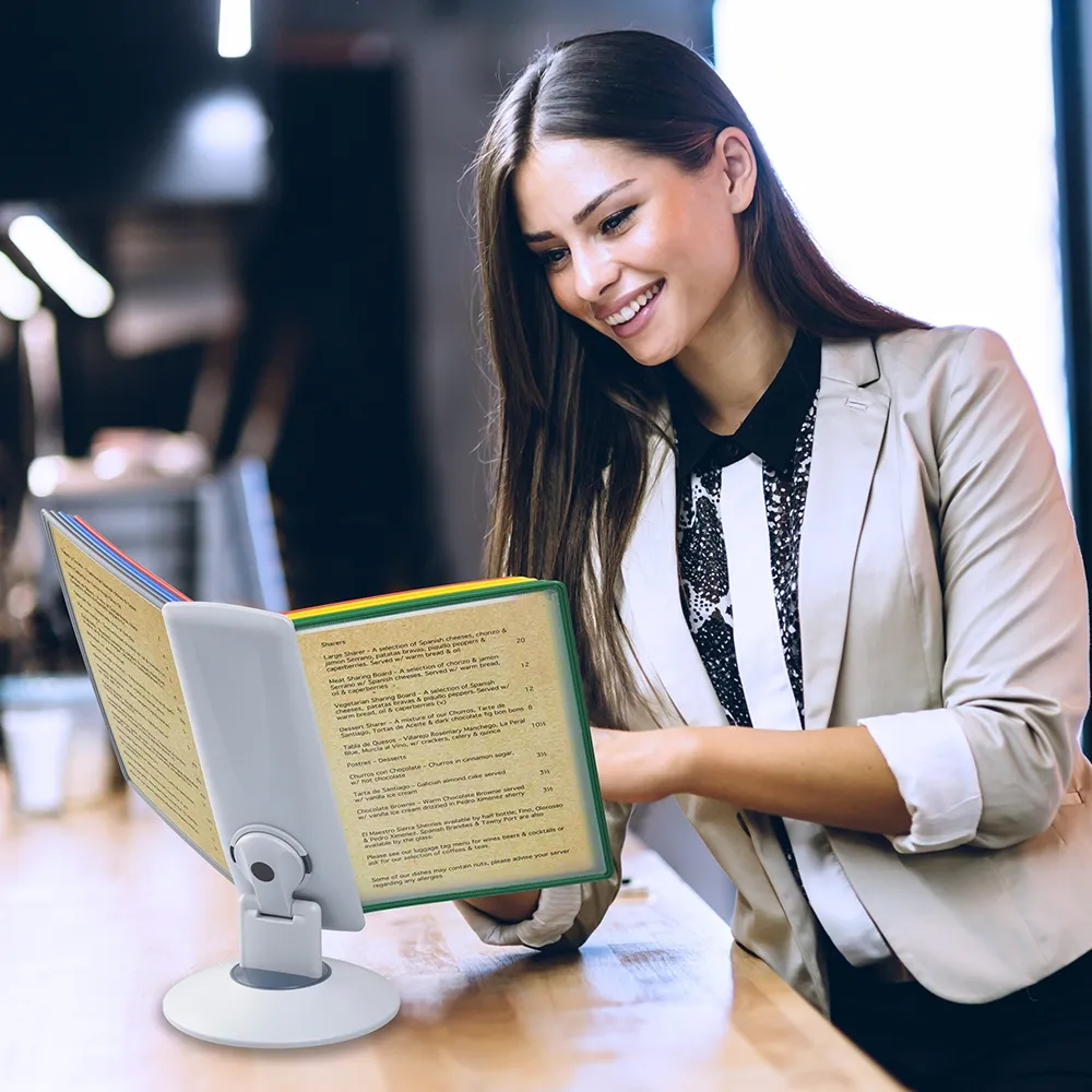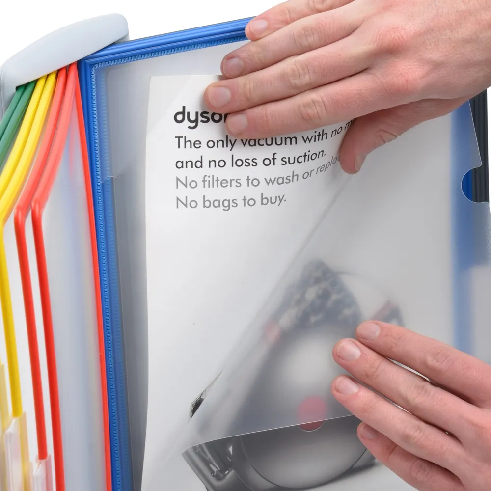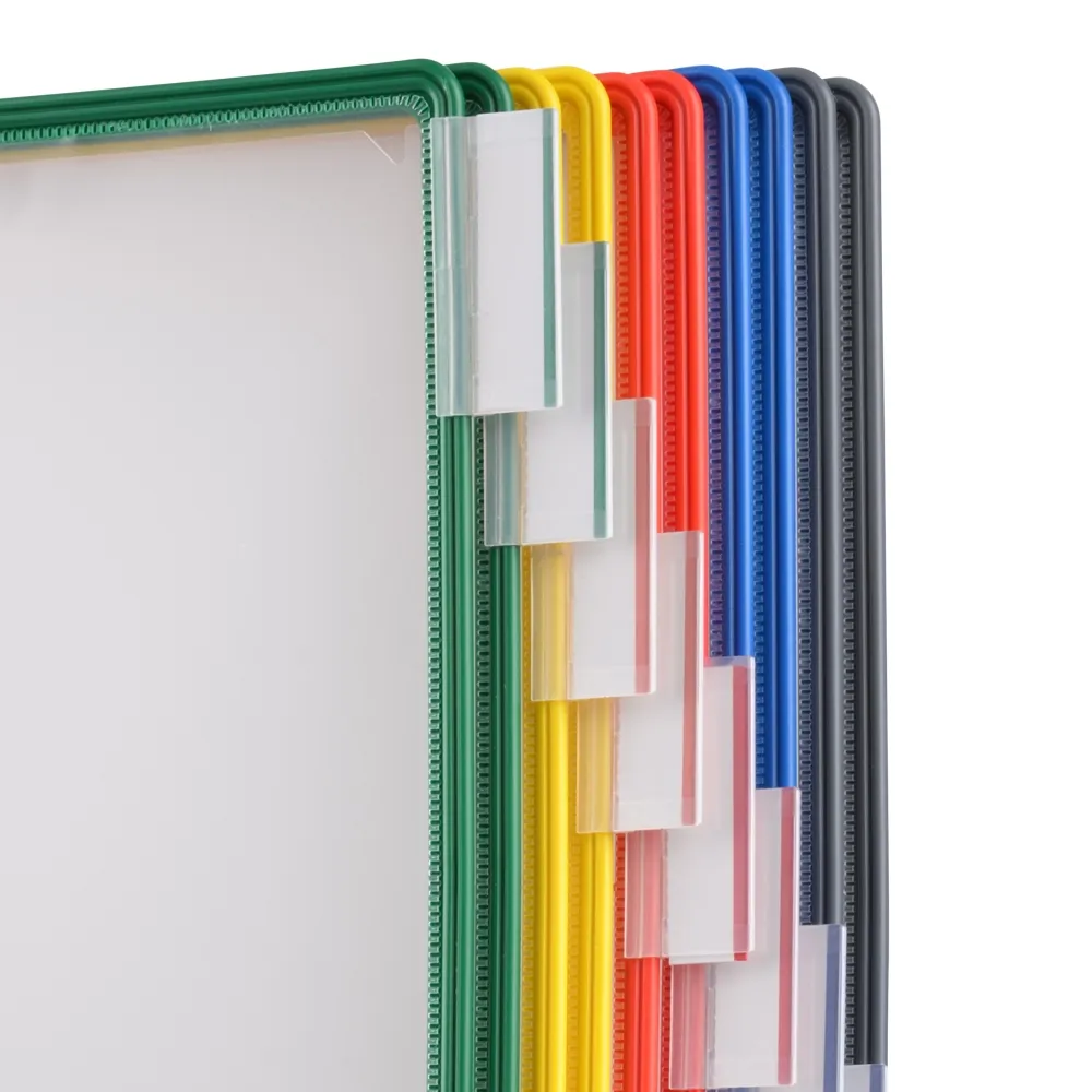 A desktop reference system is a great way to organise a variety of different documents for easy viewing by visitors, employees, and patrons. The document flip stand has (10) sleeves for placing these documents, with A4 (210 x 297mm) standard sized items being the perfect fit. You can place your A4 graphics in landscape or portrait orientation, as the entire display easily goes between formats for easy reading. There are multiple colours of pockets to allow coordination between references to make it easier for users to find what they are looking to view.