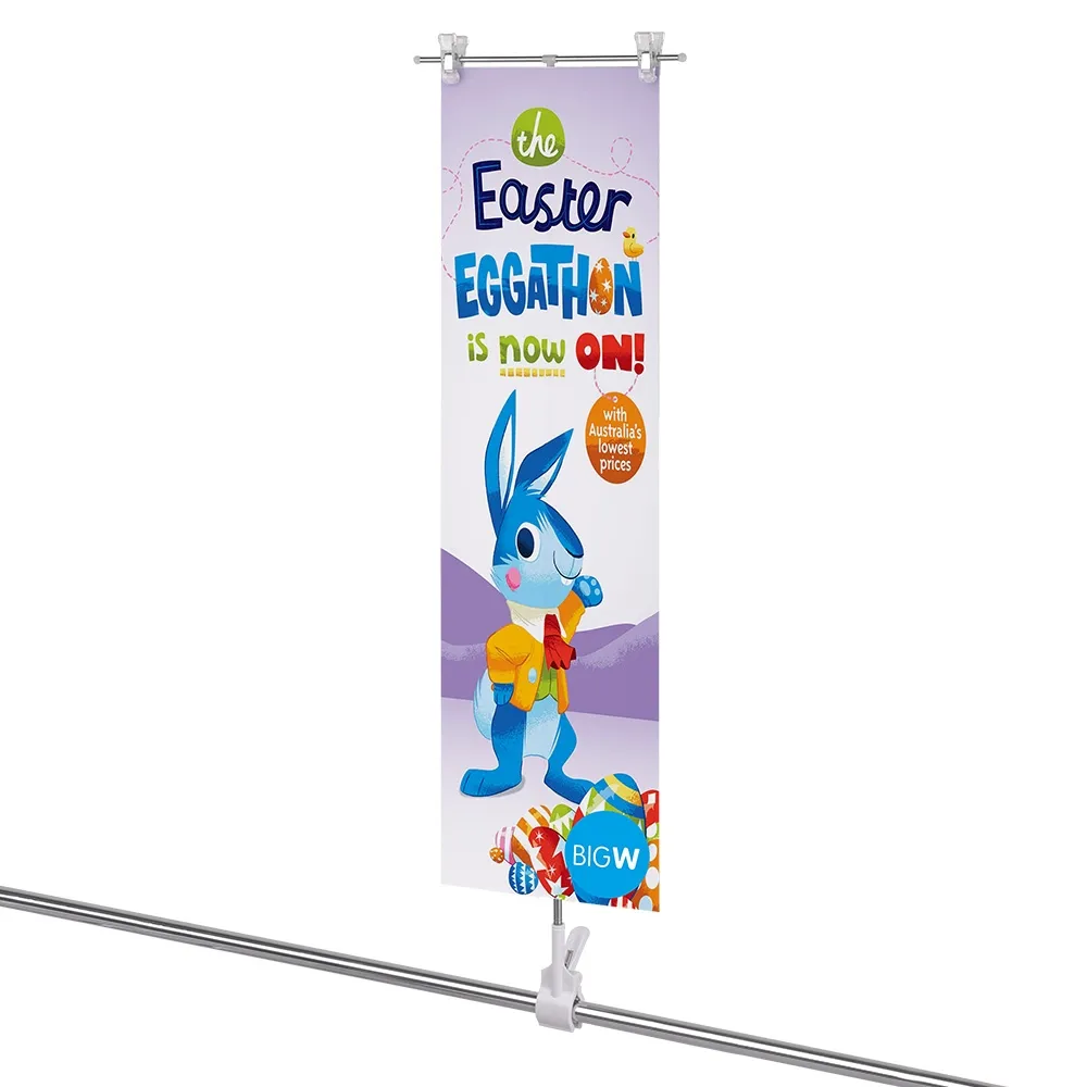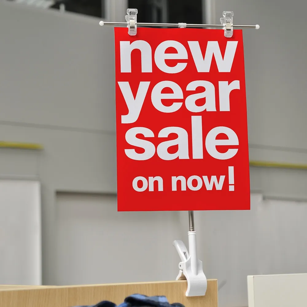 These clip on sign holders are versatile displays, able to hold a wide range of signage to make marketing & promotions at your location easy! These retail store fixtures use an adjustable bar that ranges from 350mm through 910mm, making it easy to display a wide range of signage sizes. The display uses a combination of white plastic with chrome aluminium to provide a professional look to every location.