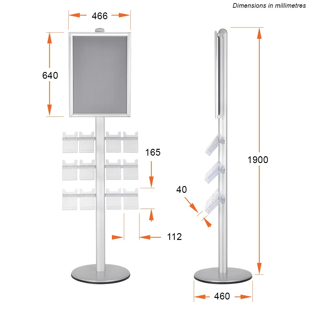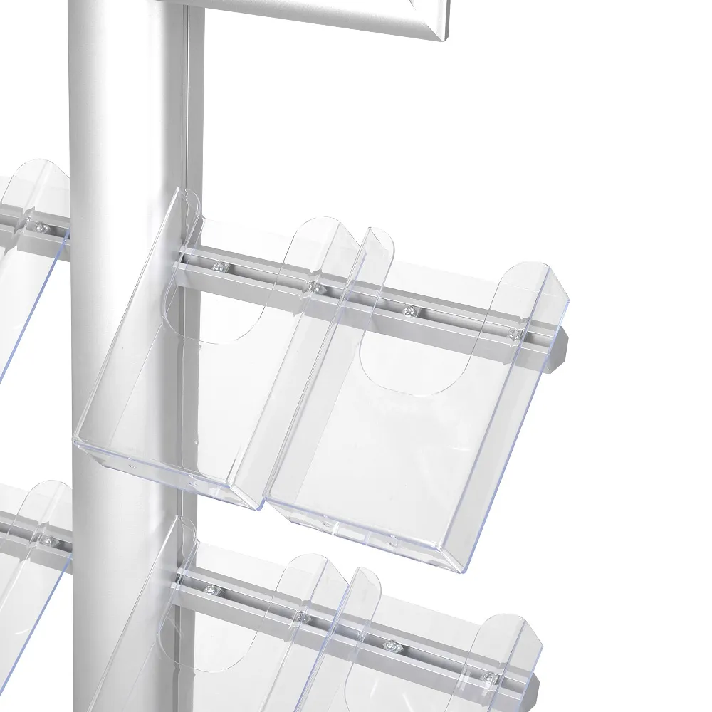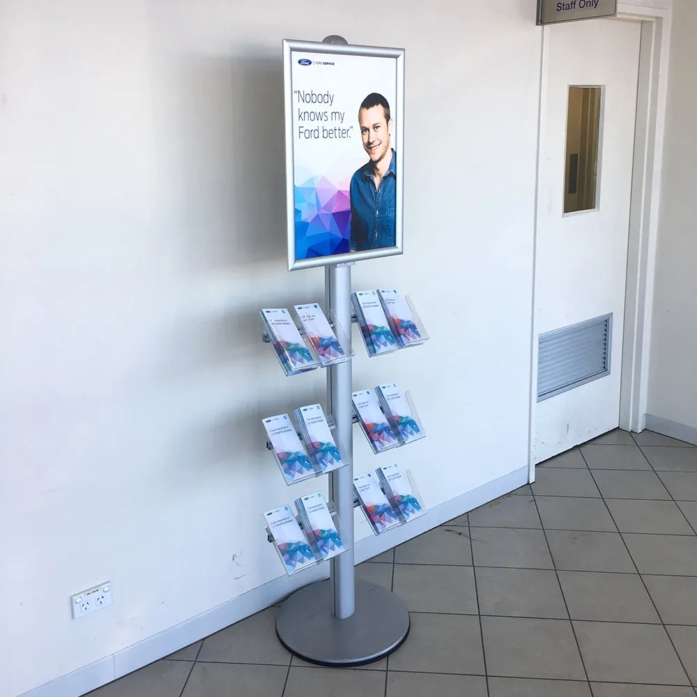 The brochure stands, display holders for brochures have (12) brochure pockets that hold DL (99 x 210mm) on each side of the display. The stand utilises (6) bars that each hold two of the pockets, making it easy to provide heaps of informational literature in one place! The pockets themselves are made from 2mm thick clear acrylic, providing durability and allowing the full cover to be seen.