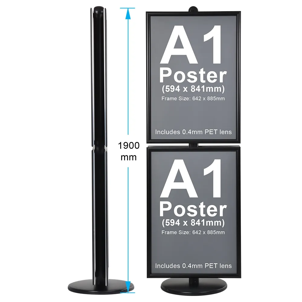 These retail poster displays, metal sign display stands are able to instantly draw passersby attention, with two snap frames on each side holding large A1 (841 x 594mm) graphics to display bright graphics with heaps of information that are easily visible. The clipframe design makes it easy to switch out posters quickly without tools needed, and the included anti-glare PET lens with each snapper frame prevent grime or dust build-up whilst helping readability. The clear lenses also help to deter vandalism directly to posters.