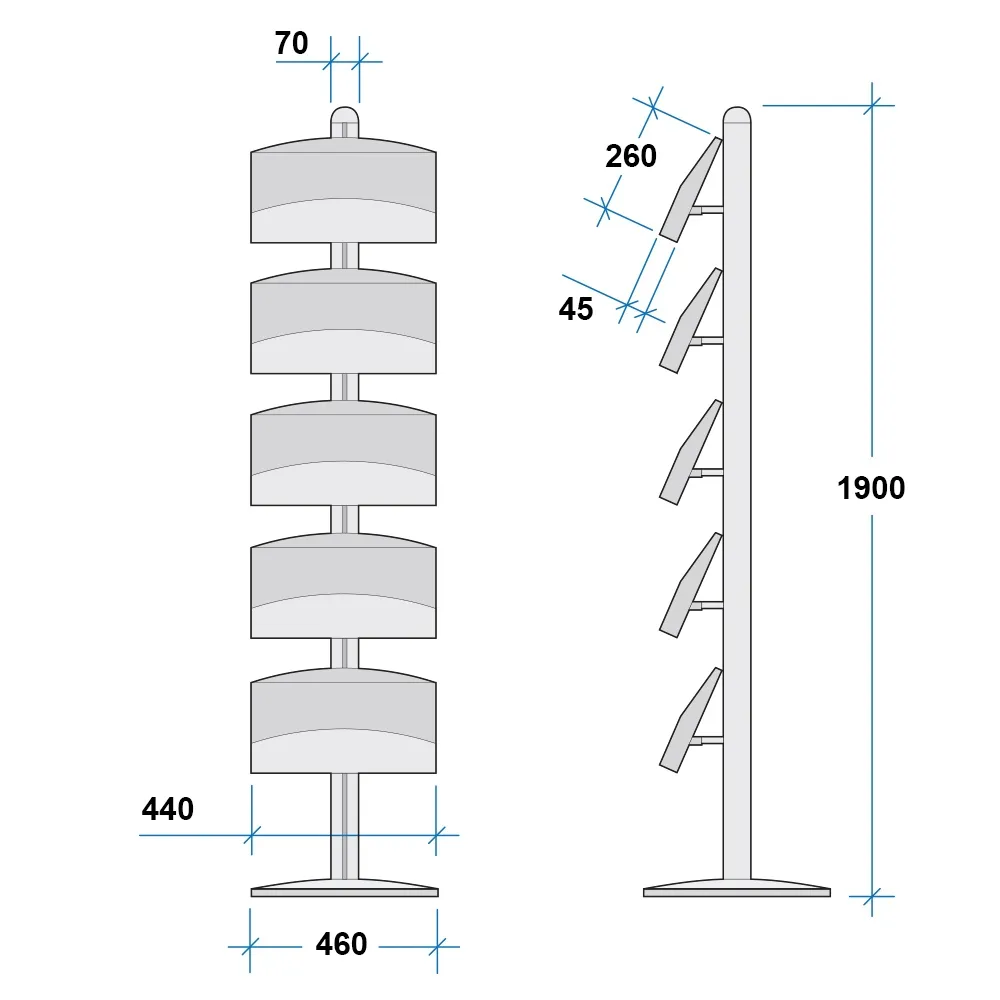 The literature stand, brochure holder is designed to hold DL (210 x99mm) pamphlets within the provided metal pockets. These pockets are angled for easy accessibility and reading from patrons, as well as being adjustable to be placed where you wish along the centre pole. The (5) pockets provide plenty of space for placing a variety of flyers, literature, catalogues and magazines at your location, order today!