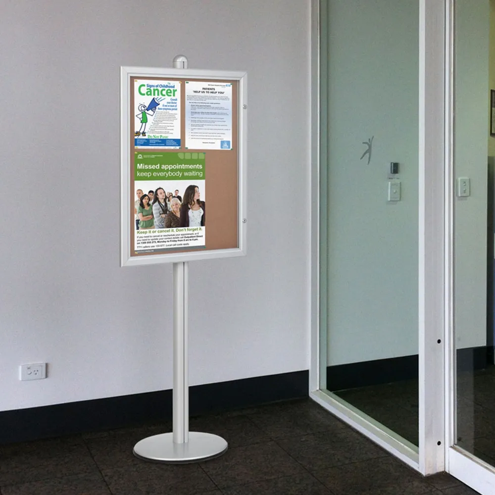 This public notice board is a great display for providing passersby with information in an easily read stand. From posting notices about important school information, upcoming events, or even menus, this versatile display can be used in many locations. Retail stores, exhibition halls, restaurants, museums, information centres, universities, and arcades are just some of the customers we've had for this item.